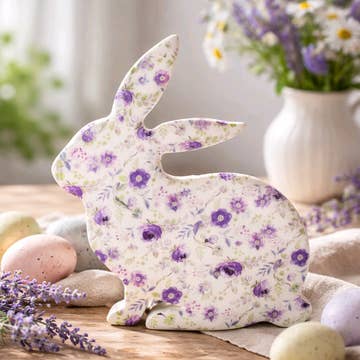 Usher in Spring with the look of natural materials and charming design found in the Carved Look Resin Bunny Sitter, 5.5"H. This resin sitter is designed with carving marks and wood texture and highlighting to give the look of a real, hand-carved piece. It depicts a darling rabbit in soft brown tones with large expressive eyes and a black nose. The bunny tends toward realistic stying with a little emphasis on its cute features. It is sitting upright with a sweet smile and has one paw raised in a welcoming posture. Measuring 5.5" tall by 4.5" long by 3.5" wide, this bunny looks lovely nestled into realistic faux florals or paired with foresty mushrooms.