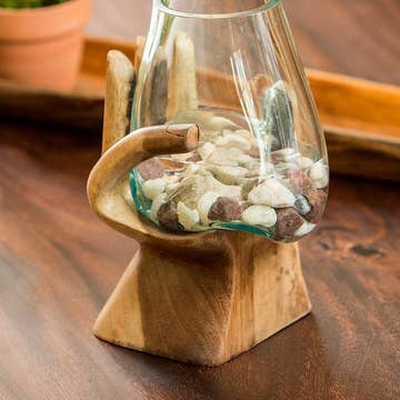 Bring an artful touch to any space with our Resin-Accented Vase with Bamboo Base — a stunning blend of modern design, natural materials, and handcrafted resin artistry. This elegant vase features a smooth, curved body accented with our signature eco-friendly resin, creating mesmerizing patterns that wrap around the form with color, depth, and movement. Paired with a warm bamboo base, it strikes the perfect balance between contemporary style and organic beauty. Each vase is individually hand-poured by our skilled artisans, ensuring that no two pieces are ever exactly alike. The resin’s flowing design highlights the natural grain of the bamboo and adds a vibrant, sculptural element that makes the vase just as captivating empty as it is filled with fresh or dried florals. Ideal for console tables, dining rooms, entryways, or shelves, this piece elevates any room with its unique blend of texture and artistry. Whether styled as a standalone focal point or incorporated into a decorative vignette, it brings a sense of sophistication and warmth to your home. Beautifully crafted and thoughtfully designed, our Resin-Accented Vase with Bamboo Base also makes a memorable gift for housewarmings, weddings, birthdays, or anyone who appreciates a truly distinctive piece of décor. Pair it with our resin-accented glassware, charcuterie boards, or coasters to create a cohesive, art-inspired collection throughout your space. The perfect fit for Home Decor stores, Garden Centres and Florists. Dimensions: 10" tall, 4" diameter
