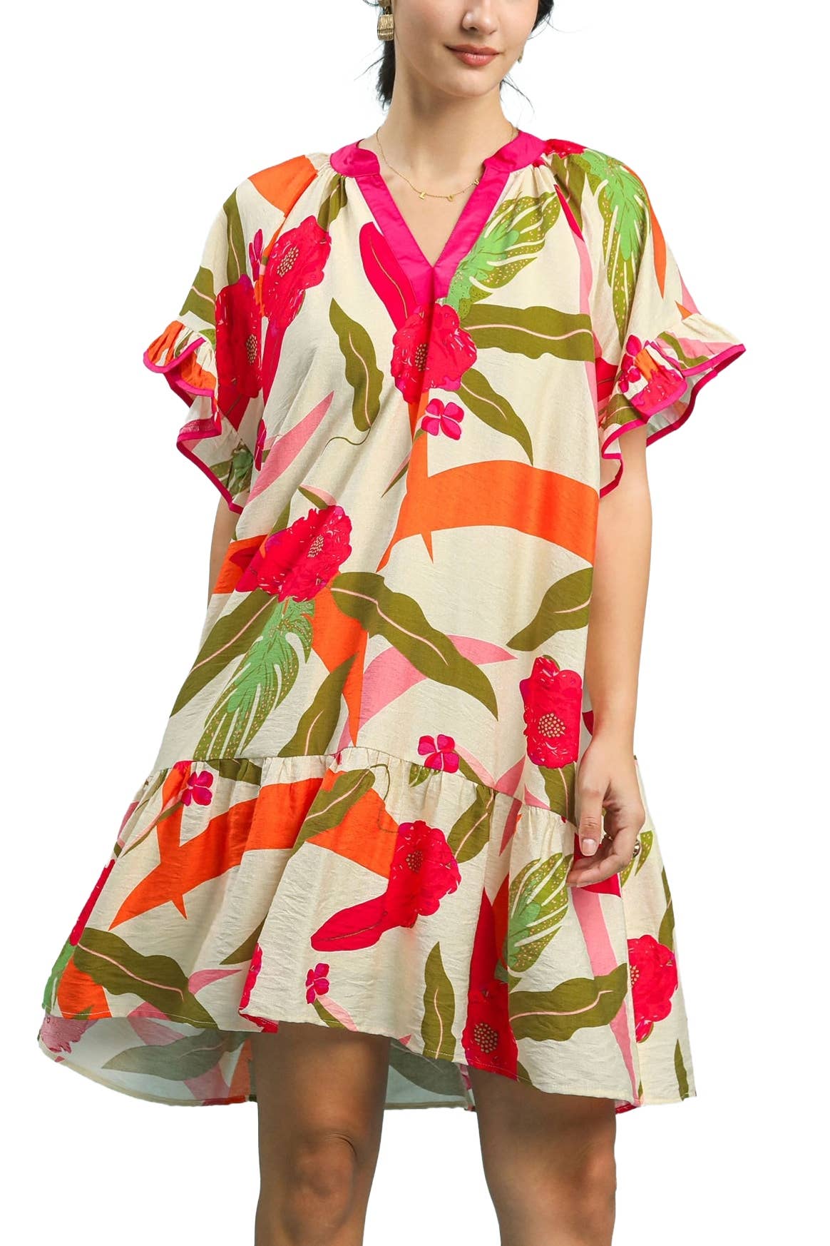 Elevate your style with the Cadenza dress, designed for functionality and comfort. Made with luxurious soft polyester, it features a sophisticated tropical green leaf print, v neck, and 3/4 flare sleeves. Perfect for travel with its knee-length and pom pom detail. Be exclusive, wherever you go. Style No. Cadenza S25-003MIN-A-TRV2 Details & Care: Poly Machine wash cold. Air dry recommended.. Measurements for size M: Bust (circumference): 42 in (106.68 cm) Length (from shoulder): 37 in (93.98 cm) Model measurements: Katie wears size M Height: 5ft. 11 in (177.8 m) Bust (circumference): 33 in (83.82 cm) Waist (circumference): 27 in (68 cm) Hips (circumference): 38 in (96.52 cm)