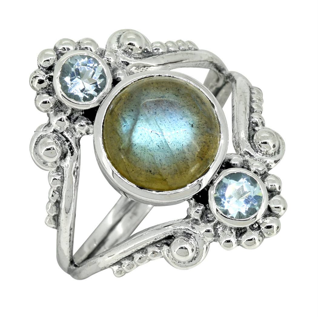 * Round Genuine Rainbow Moonstone * Tiny Hidden Secret Compartment (6mm Round) * Weight is Approximately 2.8+ Grams * Marked .925 Bali scrollwork and a touch of brass with gold-tone leaf accents highlight a round genuine Rainbow Moonstone which flashes blue in the light. The top opens with a hinge and lifts to reveal a small hidden compartment.