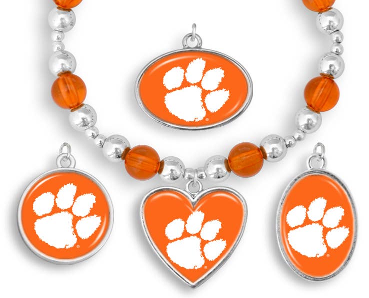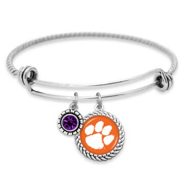 This Three Charm Logo Bangle Bracelet is adorned with three sports themed charms: #1 fan charm, full team color logo charm, football shaped charm with team wordmark. The durable tension clasp ensures care-free wear, so no need to worry it will fall off when cheering for your team as they score the winning touchdown.