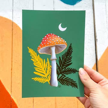 Storybook-style mushrooms. Art Prints*: — Giclée printed on a thick matte paper, 200gsm. — Acid-free, neutral-white paper with a subtle watercolor texture. Full bleed. 4x6 Print**: — 4x6 size — 16pt premium cardstock thickness — One-sided print (small logo on back) — Smooth velvety matte "soft touch" coating on both sides **These are for decoration only, the soft-touch coating on both sides makes it not ideal for writing on. *Only Art Prints will be packaged with a backing board and plastic sleeve. *decor not included*