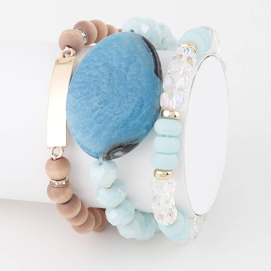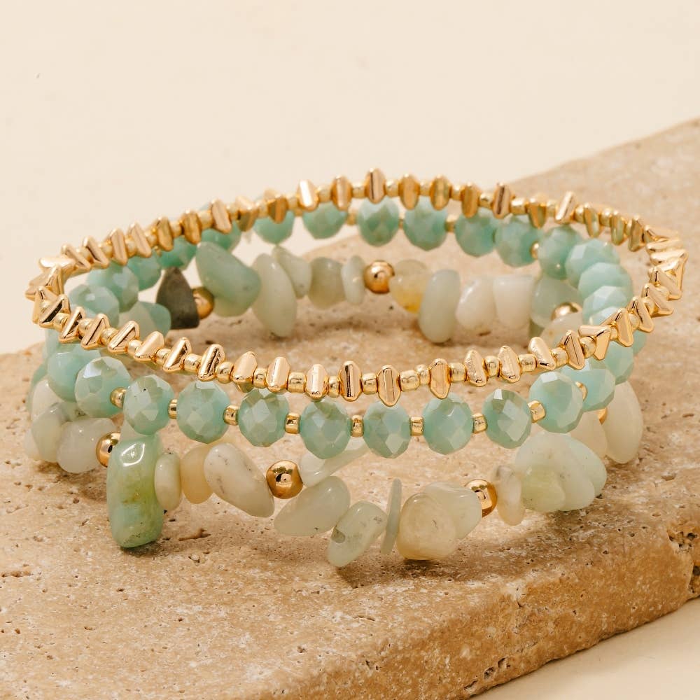Stunning gemstone stretch bracelets with center accents in faceted gemstones bookended by shiny gold plated discs. Elastic Mykonos bracelet series. Fancy-up your arm candy with our Mykonos bracelets! Strut your stuff in shimmering gemstone stretches, flaunting center accents of faceted gems and twinkling gold plated discs. Elasticity eases on and off - what a gem! Add a burst of color to your look with the vibrant Mykonos Bracelet! Featuring a mix of bright blue turquoise, coral and center faceted gemstone cubes of all semi precious stone colors such as hot pink, green, labradorite, carnelian, gold rutile, amazonite and more, this beautiful bracelet is the perfect way to stand out and make a statement. Coral beads discontinued
