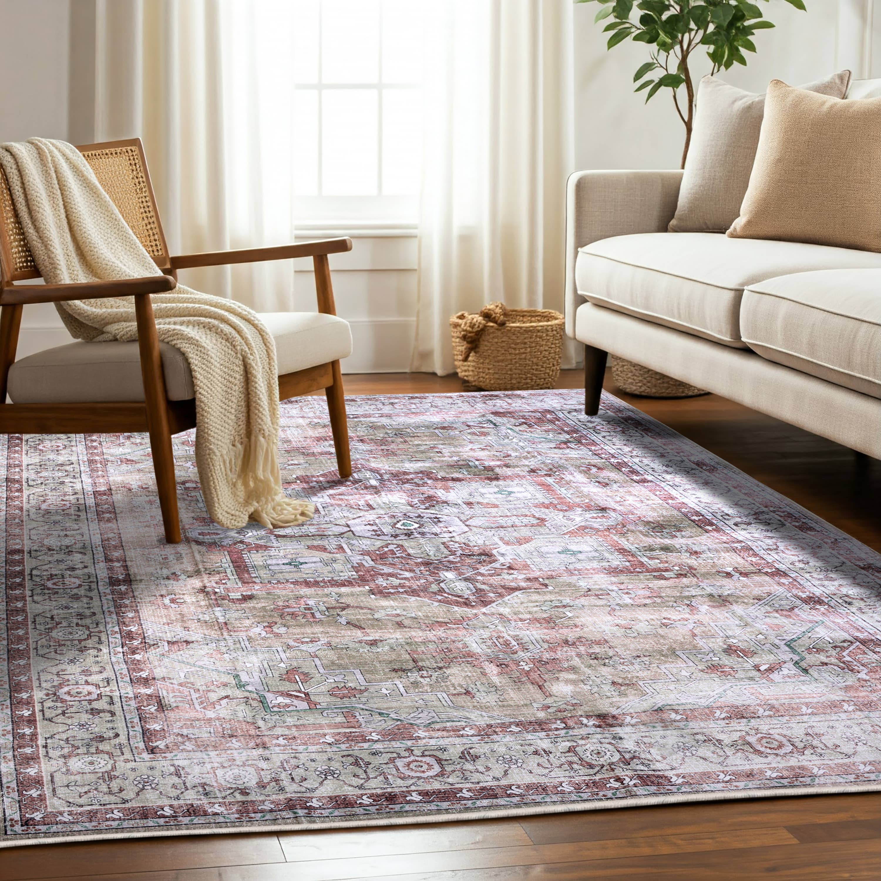 This 9-foot x 12-foot blush pink and mauve patchwork washable indoor outdoor area rug, is a great way to add warmth to a room. This rectangle shaped rug features a patchwork design that will work well both indoors or out. A classic shape marries with good looking design for your living room, hall, bedroom, porch, patio, or poolside. Ideal for outdoor spaces or high traffic areas with kids and pets, this rug is made from heavy duty polyester that is stain resistant to help repel water, dirt, and stains. 108-inch h x 144-inch w x 0.19-inch d.A felt backing covers this rug to finish the look, keep the fibers in place, and help to keep the rug from slipping.Classically shaped, this versatile rectangular rug is a great way to accent your indoor or outdoor space.machine made outdoor rug with stain-resistant polyester material.Machine woven rugs offer precise design and designer looks for a fraction of their handmade counterparts.Rug is machine washable for ease and convenience.