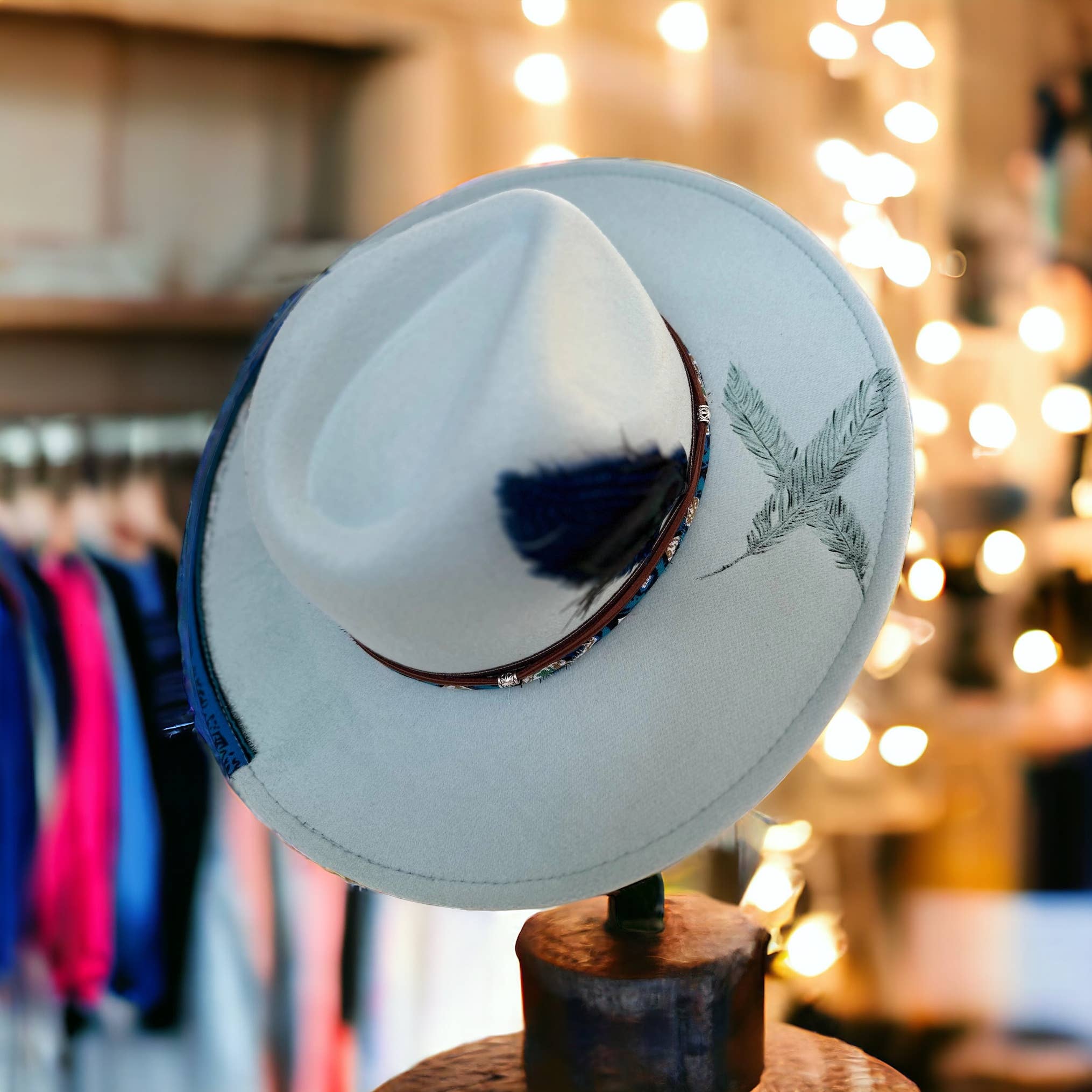 A spin off of our original Hold My Halo cowboy hat! This one is GORGEOUS! We burnt this angel wing design onto our incredible, vegan suede style rancher hat. We hand paint every hat with a shimmery, beautiful paint that just elevates the gorgeous deep cocoa color. Finished off by burning the hats high pants for depth. Fully adjustable. ***Please note the card and accessories may vary slightly due to demand. Please also note the paint will vary due to the handmade individual nature of this product.