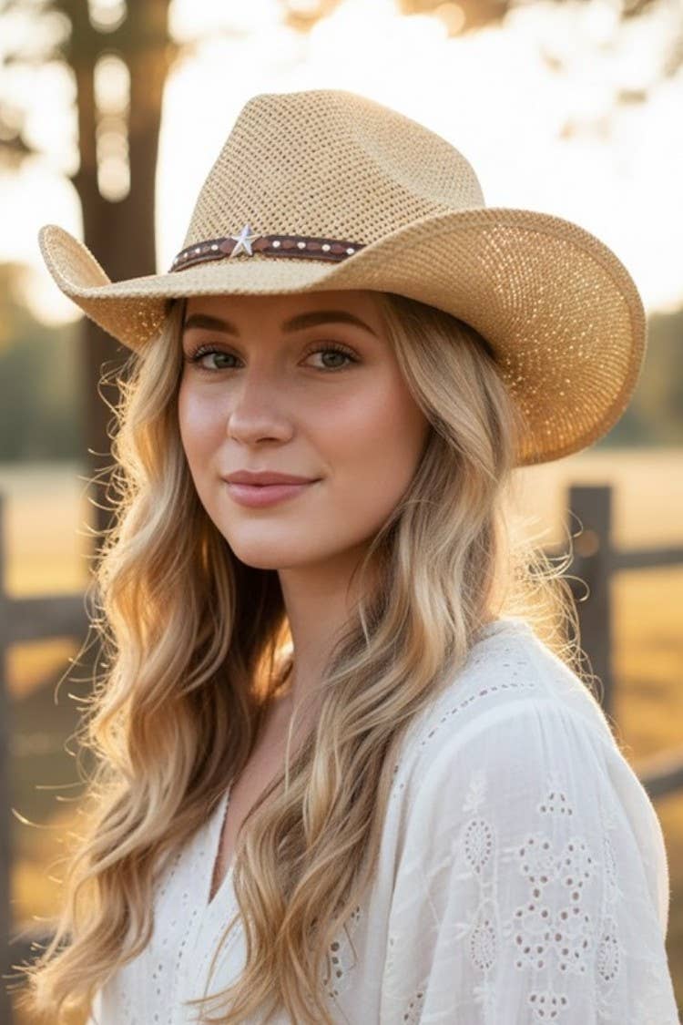 Cutter Crown Relaxed Taco Brim Resin Coated Natural Palm Leaf Straw Cowboy Hat -Brim Size: 4" -Dimensions: 16.5" * 14" * 6" -Eyeleted Closed Weave Upper Crown -Studded Faux Leather Trim Belt (NOTE: Belt pattern and color will vary. Images are for reference) -Adjustable chin strings (NOTE: string color will vary. Brown & Black) -Head Size: OS (About 57cm-58cm AKA M/L) with inner elastic band -100% Palm Straw -DISCLAIMER: These items are handcrafted in Mexico, resulting in expected variations such as burn marks and uneven textures. Flaking from the resin coating is a normal occurrence from the manufacturing process and NOT considered a defect.