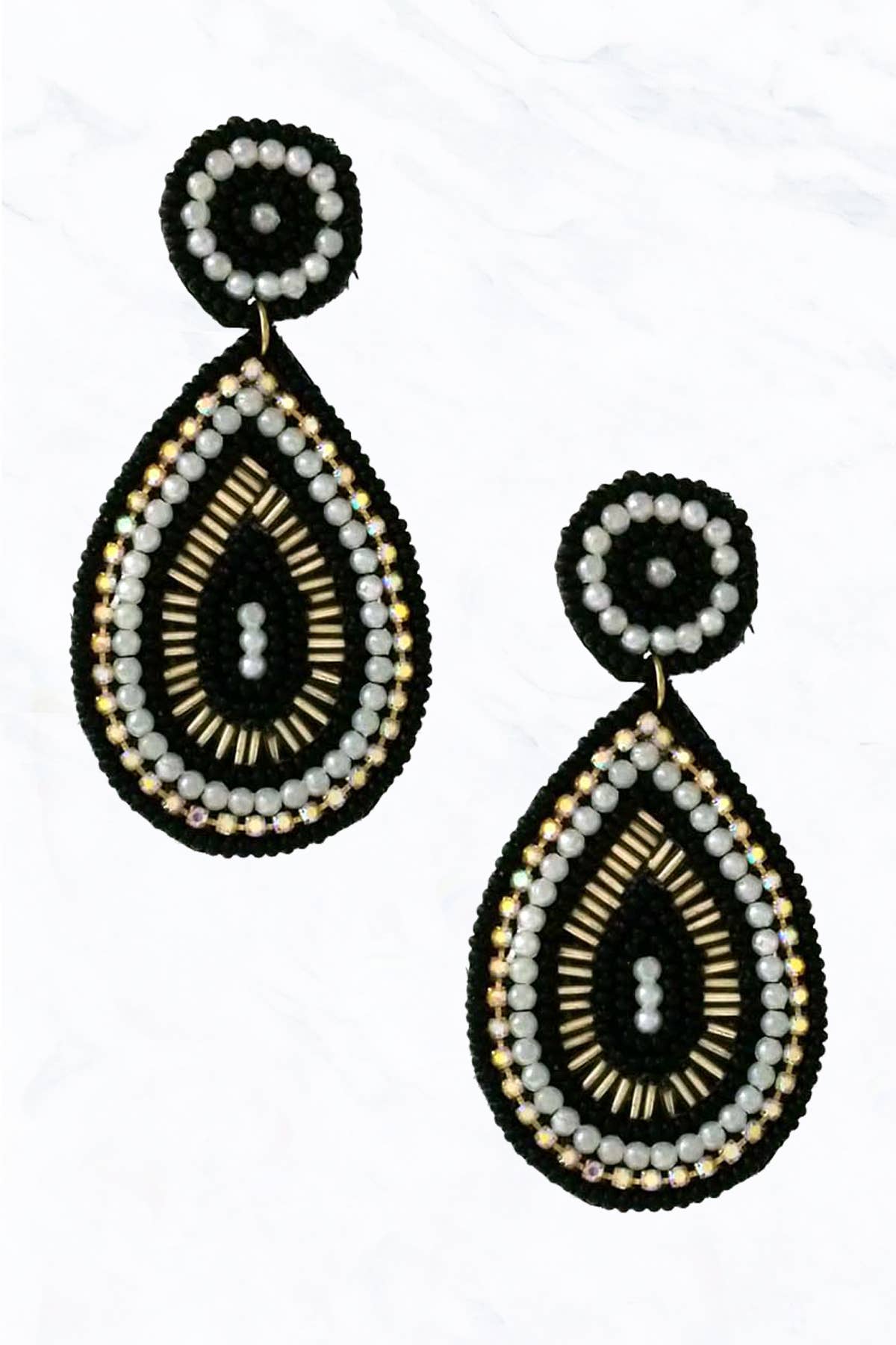 SKU: ER-WO-WH-018 Made in Colombia Color: Black and Off-White Is Set: Individual Material: Glass and Gold Filled Occasion: Elevated Casual and Everyday Style: Classic and Culturally-Inspired Theme: Geometric Product Language: English Weight: 10.77 g (0.38 oz) Dimensions: 5.8 x 3.3 cm (2.3 x 1.3 in) Product Materials: Vegan Packaging: Plastic-free and Recyclable Production: Ethically sourced