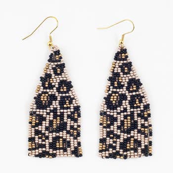 These handwoven Miyuki glass beaded earrings feature a bold geometric pattern which contrasts against the background color. Adding to their uniqueness is the tubular fringe hung from the bottom of the woven square with accenting gold beads at the tips. This a classic but elegant design that can easily transition from day to night and from season to season making it a staple in one's accessory collection. These earrings are handwoven by women artisans in Medellin, Colombia who receive fair working conditions and compensation for their skills. Materials Miyuki Glass Beads Gold-Plated Bronze Square Component Size Length 2.3 Inches Width 1.3 Inches **The last photos are included to show our earring cards and in-store merchandising.