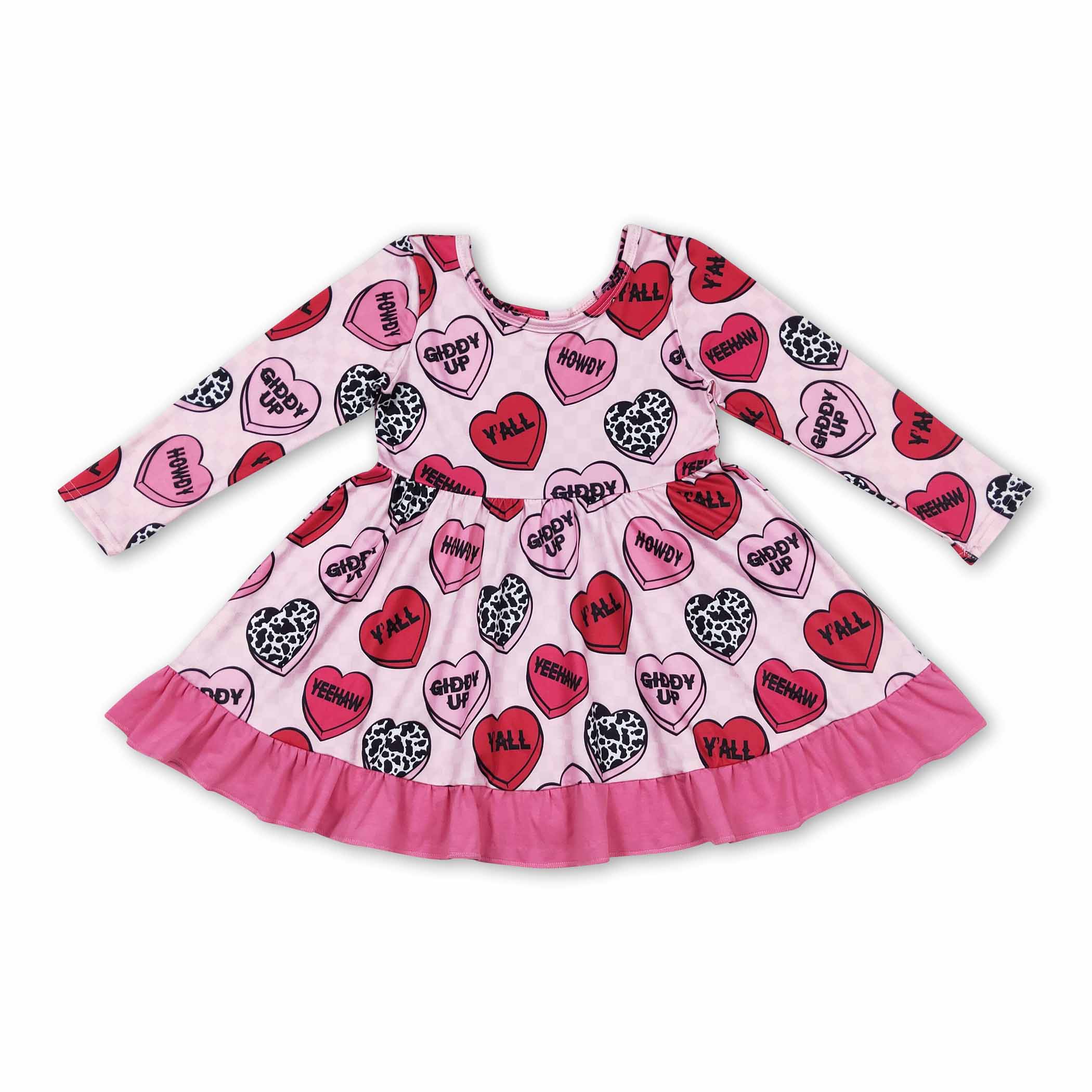 Celebrate love in the sweetest way with our Pink and Red Heart Valentine'Ruffle Dress! This adorable dress features a crisp white collar adorned, and has embroidered pink hearts, adding a charming touch to her look. The flutter sleeves and playful ruffle details make it extra fun and twirl-worthy, perfect for spreading love and joy all day long. This dress is sure to make hearts flutter!