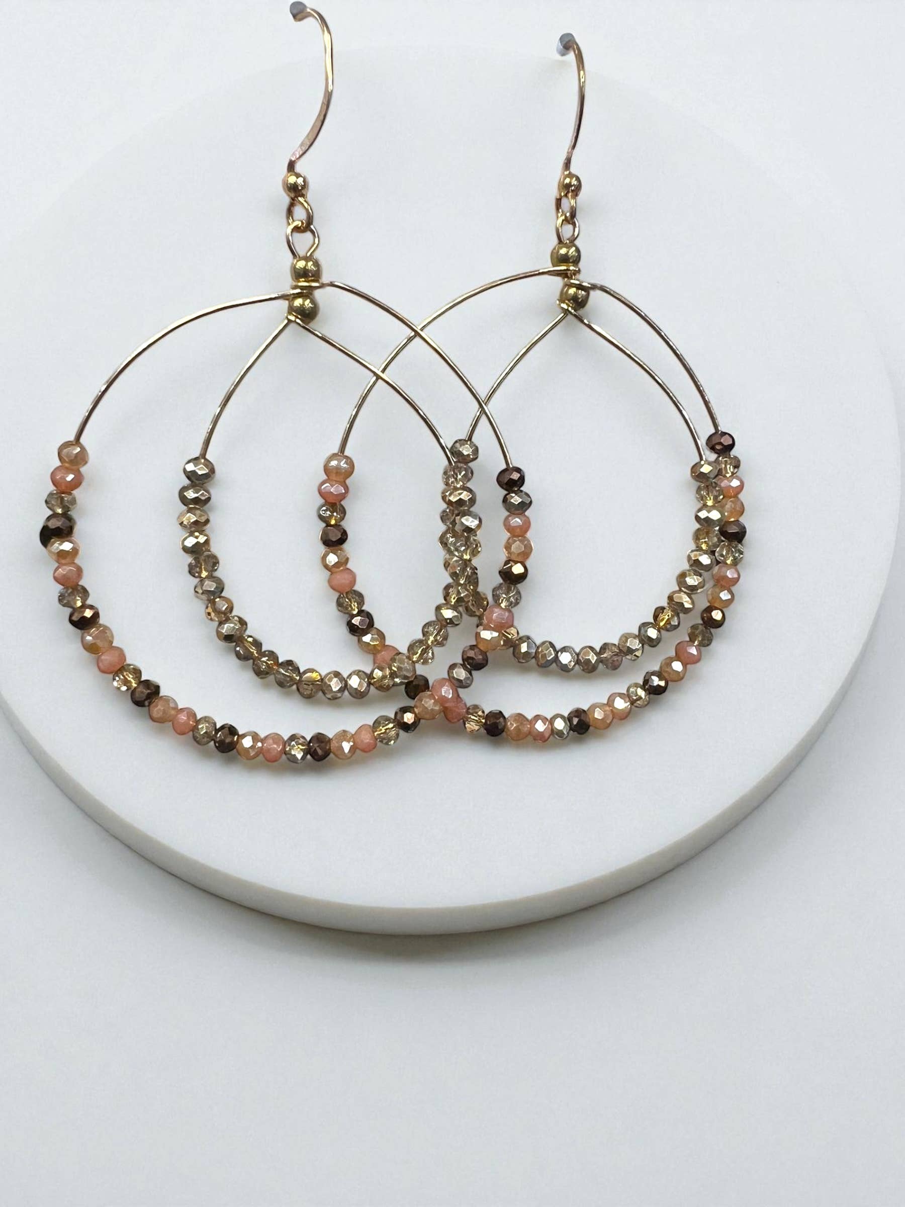Fishhook beaded, teardrop shaped hoop earrings with a small gold dangle bead. Lightweight. Feature African Turquoise stone and gold crystal beads. Length: 3"
