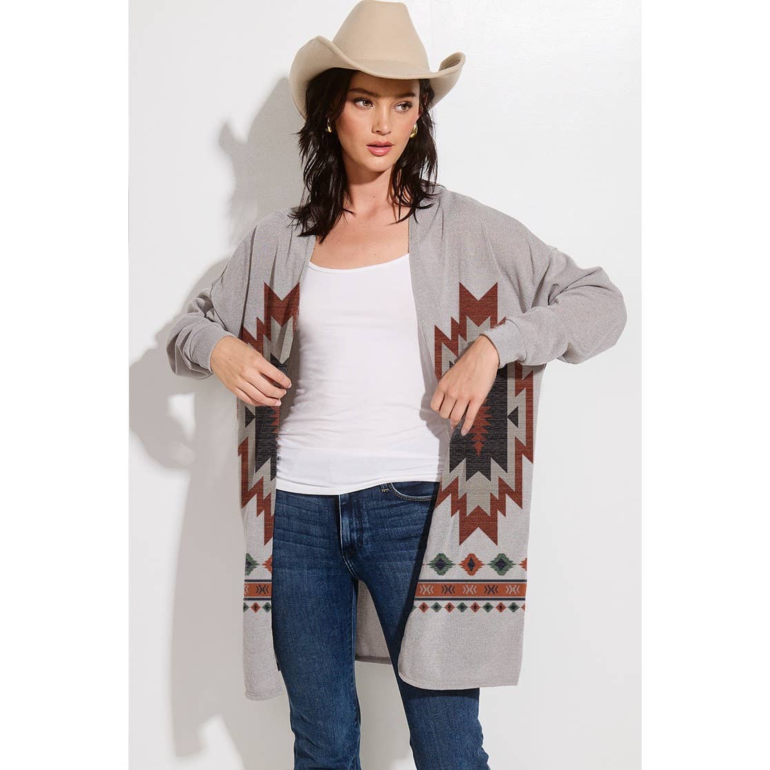 -Aztec long cardigan -Soft fabric, casual style, every day wear. -Model size: Small ( 5'10" 31- 23- 34 ) -Made in USA