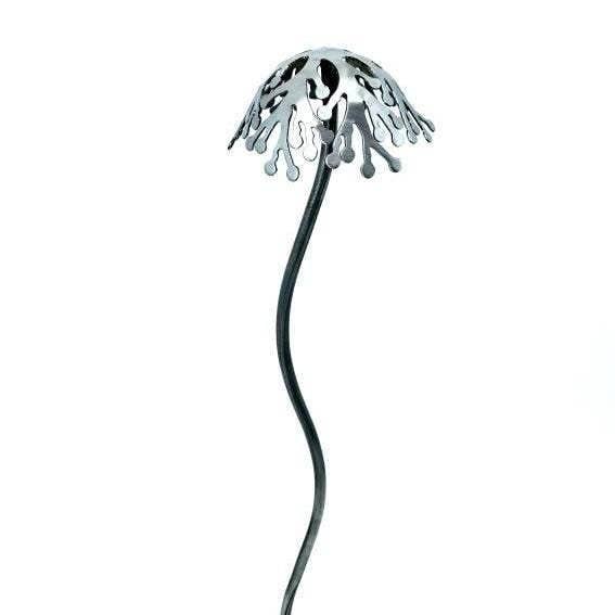 Add a little whimsy to your garden with this double bee garden stake. The bees are cut from 20-gauge steel and welded to a sturdy ¼" rod. There is a triangle welded to the base of the stake for easy step-in. These bees and the stake will weather naturally and turn a deep brown patina. Item will come in various states of rusting process. Total length is approximately 33" long (bee and stake). The bees are approximately 3 1/2" wide by 2 1/4"long. Each bee has a yellow, 16mm marble in the center . Please note: this piece contains small glass marble(s) that are not suitable for children and may pose a choking hazard.