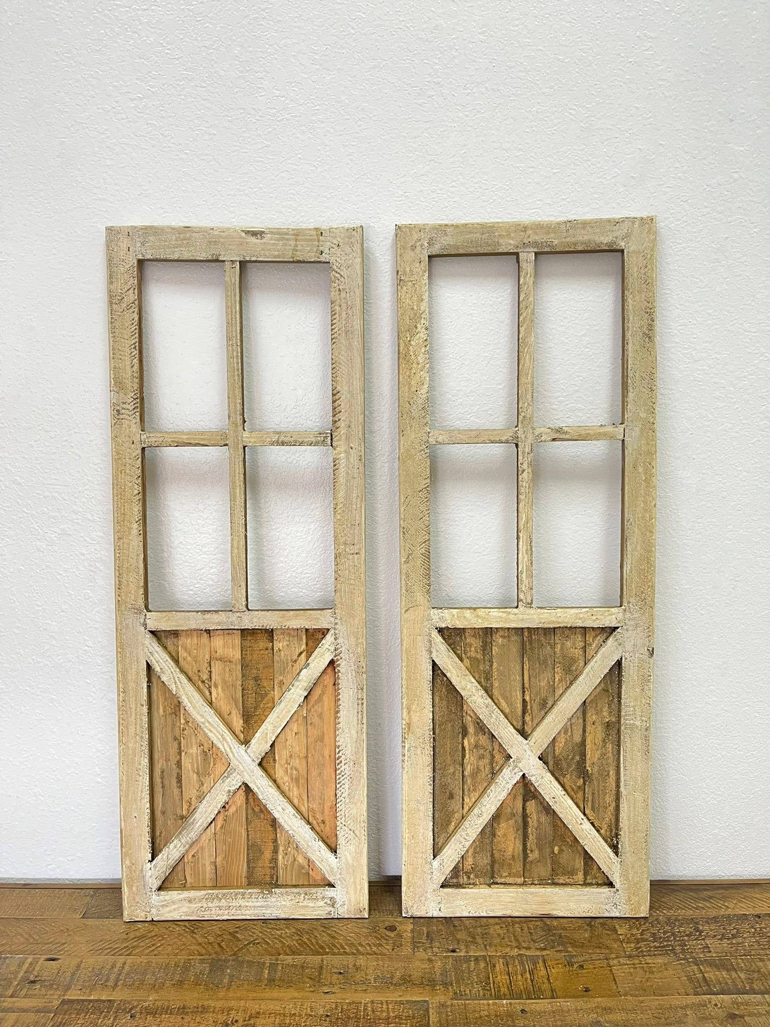 Our newest design is this beautifully made Old Creek wall decor window. These gorgeous decorative wood windows measure about 12 x 48 inches and is our newest entry in our super popular architectural wall decor windows. We offer three soft distressed colors to choose from: Turquoise, Antiqued White and Vintage White. We have many different designs available. Please understand that each one is handmade and will be each one of a kind, with varying degrees of distressed color.