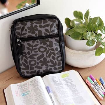Anyone who loves the twenty-third Psalm will enjoy this beautiful Bible cover with silhouetted sheep scene and Psalm 23 in its entirety. Sturdy canvas style fabric is a 600 denier polyester. This cover has many great features: open storage pocket on back, convenient carrying handle on side; spoon shape open cross zipper pull; a side zipper that is non-rusting and self-repairing; attached pen loop and ribbon bookmark inside, lay flat construction and nylon reinforced stitching. Comes with corrugated box insert to maintain shape. This is the Large size and holds a Bible or book up to about 9 1/2" x 7" x 1 3/4".