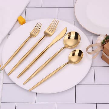 The Vikko Arlington Gold 18/10 Flatware 20Pc Set for 4 presents a harmonious blend of modern sophistication and timeless elegance, ideal for elevating any dining experience. • Indulge in the allure of softly shimmering gold, as each piece of this set embodies the perfect balance of contemporary luxury and enduring quality. • Crafted from premium 18/10 stainless steel, this set exudes robustness and resilience while maintaining an elegant, refined appearance. • Designed for those who value the artistry of fine dining, this set adorns any table setting with a touch of opulence, making everyday meals a grand affair. • The Vikko Arlington Flatware Set cultivates a dining atmosphere that is both welcoming and lavish, effortlessly transforming any meal into a memorable occasion.