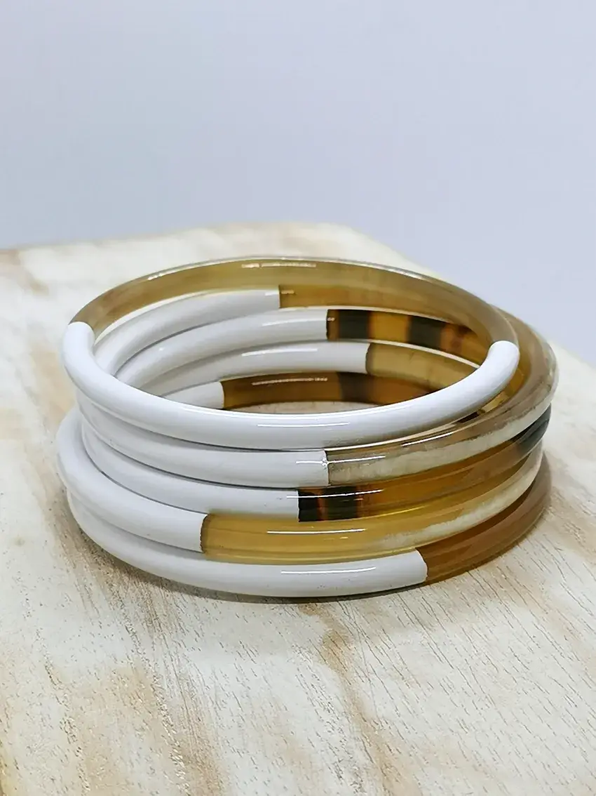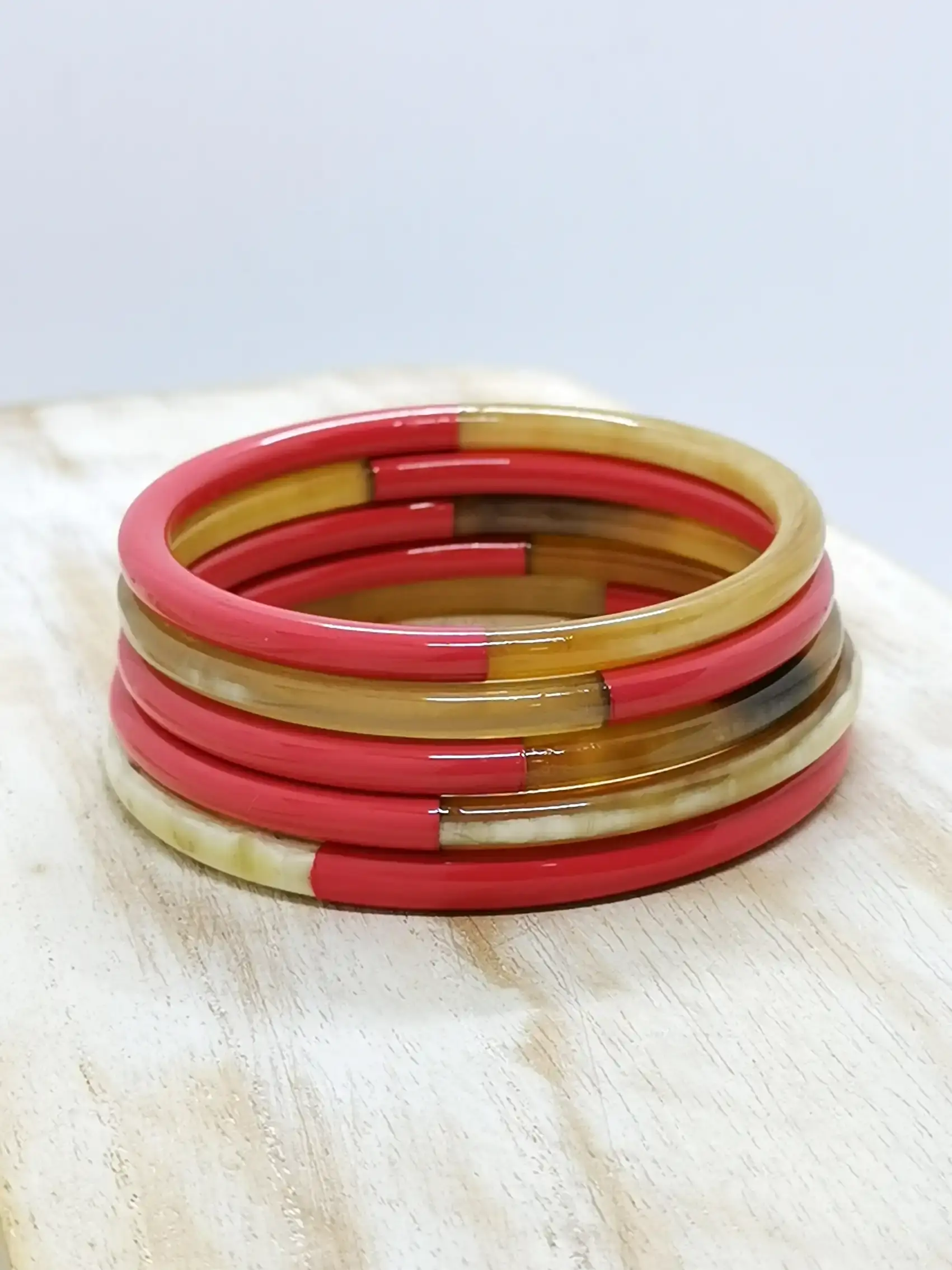 Discover our magnificent coral-colored horn bangle, an essential accessory to add a touch of color and elegance to your wrist. Made from natural horn, this bangle features a unique design with one half in vibrant coral pink and the other half in natural, creating a harmonious contrast. Material: Buffalo horn Inner diameter: S/M: 6.1 - 6.4 cm M/L: 6.5 - 6.8 cm Thickness: 5mm