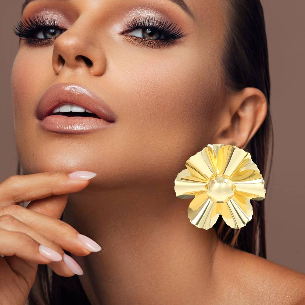 Gold Metal and Cream Pearl Luxury French Designer Inspired Flower Stud Earrings.