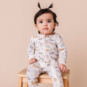 Soft viscose bamboo baby footed pajamas in our Prehistoric Friends pattern! This new dinosaur print is perfect for your dino obsessed kid! Check out more with this print for the cutest sibling match including kids pajamas and baby pajamas! SWEET DREAMS: Made from high quality bamboo, our baby pajamas are the recipe for a perfect night's sleep. Our bamboo pajamas start with our signature buttery soft bamboo/spandex blend that has the perfect amount of stretch for the most comfort. FEATURES: Our two-way zipper design makes late night changes a breeze. Fold-over sleeves keep baby from scratching, fold-over feet to keep toes warm, and printed neck label and neckline zipper protection for comfort. Color/Print: Prehistoric Friends (Dinosaurs) Fabric: 96% Viscose from Bamboo / 4% Spandex Sizing: 0-3M, 3-6M, 6-12M, 12-18M, 18-24M Fit: Stretchy / Snug Wash: Machine wash cold / Tumble dry low Imported