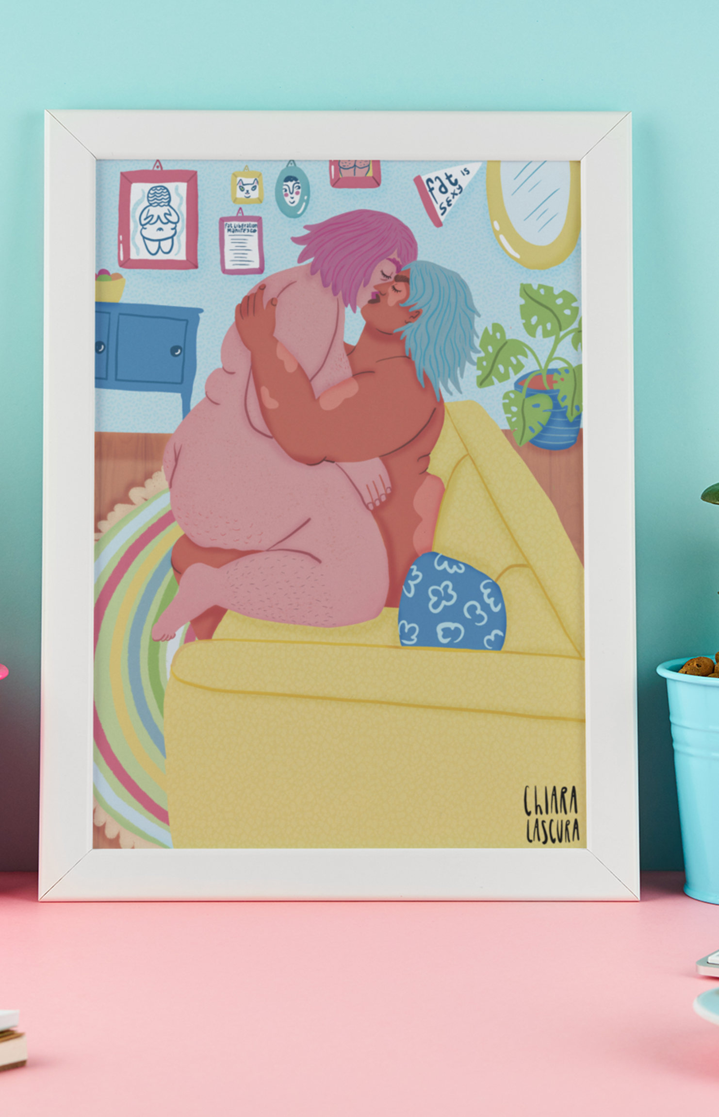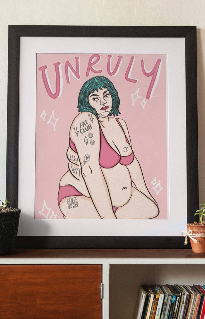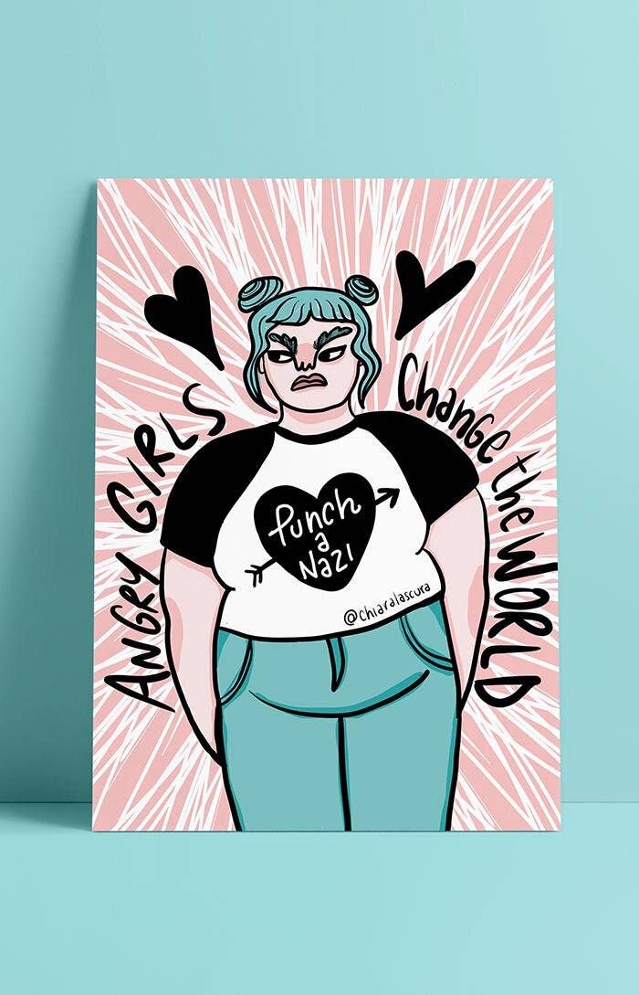 Hello! I am Chiara, an italian illustrator and activist. I design and sell illustrated stickers, pins, buttons, mugs, totes and t-shirts inspired by body positivity, feminism, sisterhood, queerness, animal liberation and mental health. I've been working as a freelance since 2010, the year I founded Chiaralascura and launched my first small collection: a few vegan-themed eco-friendly t-shirts. Since then I also started to work as a freelance illustrator and graphic designer doing commissions for organizations, festivals, and brands and creating logos, brand identity, posters and merchandising for their projects. Ive always been a feminist and in the last few years I started incorporating feminism, fat acceptance and body positivity in my work. In 2018 I co-founded Belle di Faccia, an activism project and organization that aims to spread awareness on fatphobia and to advance fat liberation in Italy.
