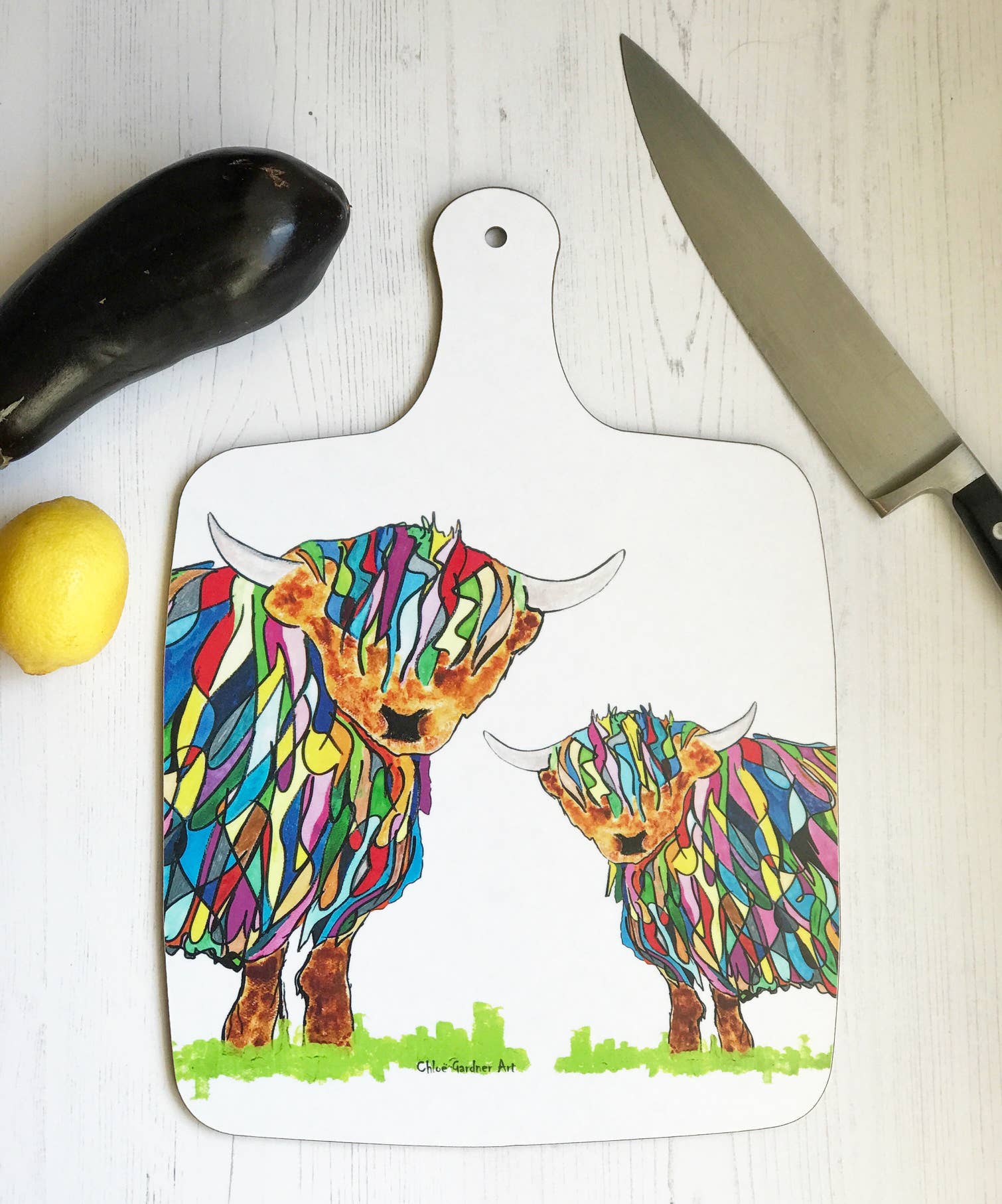 Hello! Welcome to my page. I hope you like my products. They are full of fun and I try and add something extra special that's a little different. Look carefully at the fluffy designs and you will see they were made in feathers. How did this come to be? Well... I live in a cottage in lovely airy woods on a beach in Scotland. I pick up feathers from the beach and leaves from the trees and I make animals and patterns through collage. You often have to look closely to realise this. Very different to this is my bright and colourful designs. These are inspired by the nature here in Scotland crossed with the joie de vivre of an earlier stage in my life when I lived in Buzios, Brazil. The resulting designs are contemporary, colourful and very cheerful! I am well known for my multi-coloured highland cow. (The first one of its kind). So yes I have two polar opposite styles and you will probably only love one. I hope you do - they are very different but for both, the product process is the same - the original art is taken to a specialist fine art company who scan the work and make a perfect copy which is used to make top quality beautifully made charming products. I love where possible to add a hidden wonderful surprise and lots of the products have something extra you might not expect to bring an extra smile... please do ask for more details! The products are great quality, good value and unique. There is a huge range of designs and products ranging from cards to ceramics to homewares.