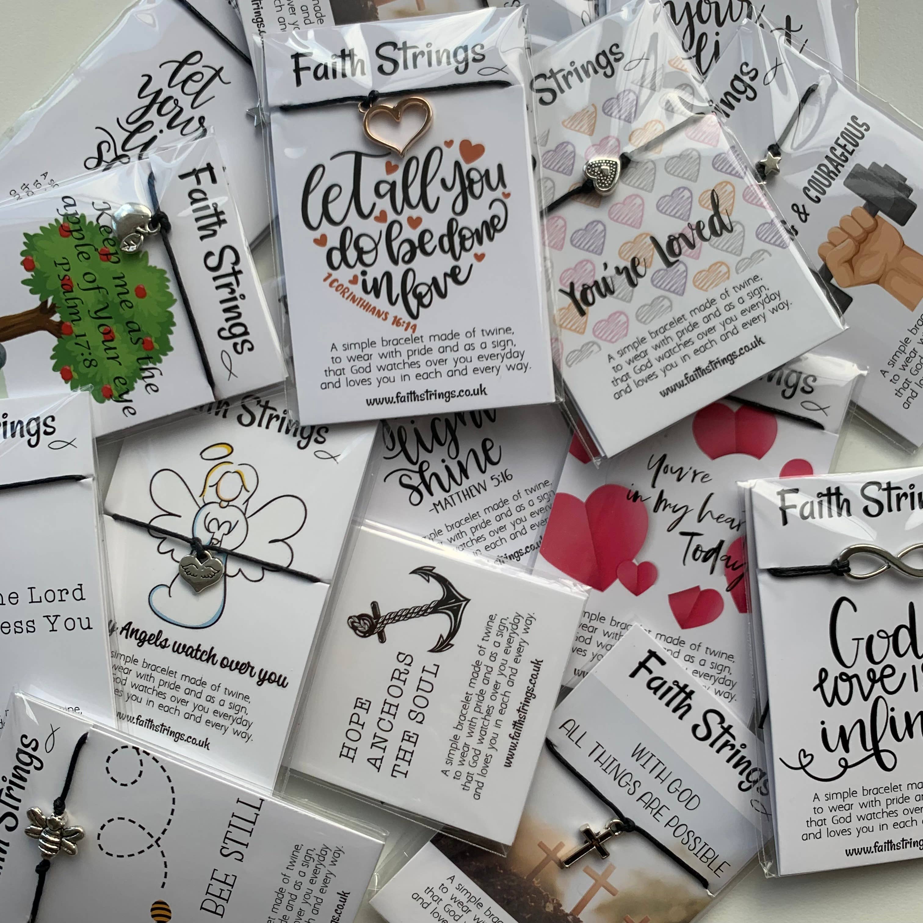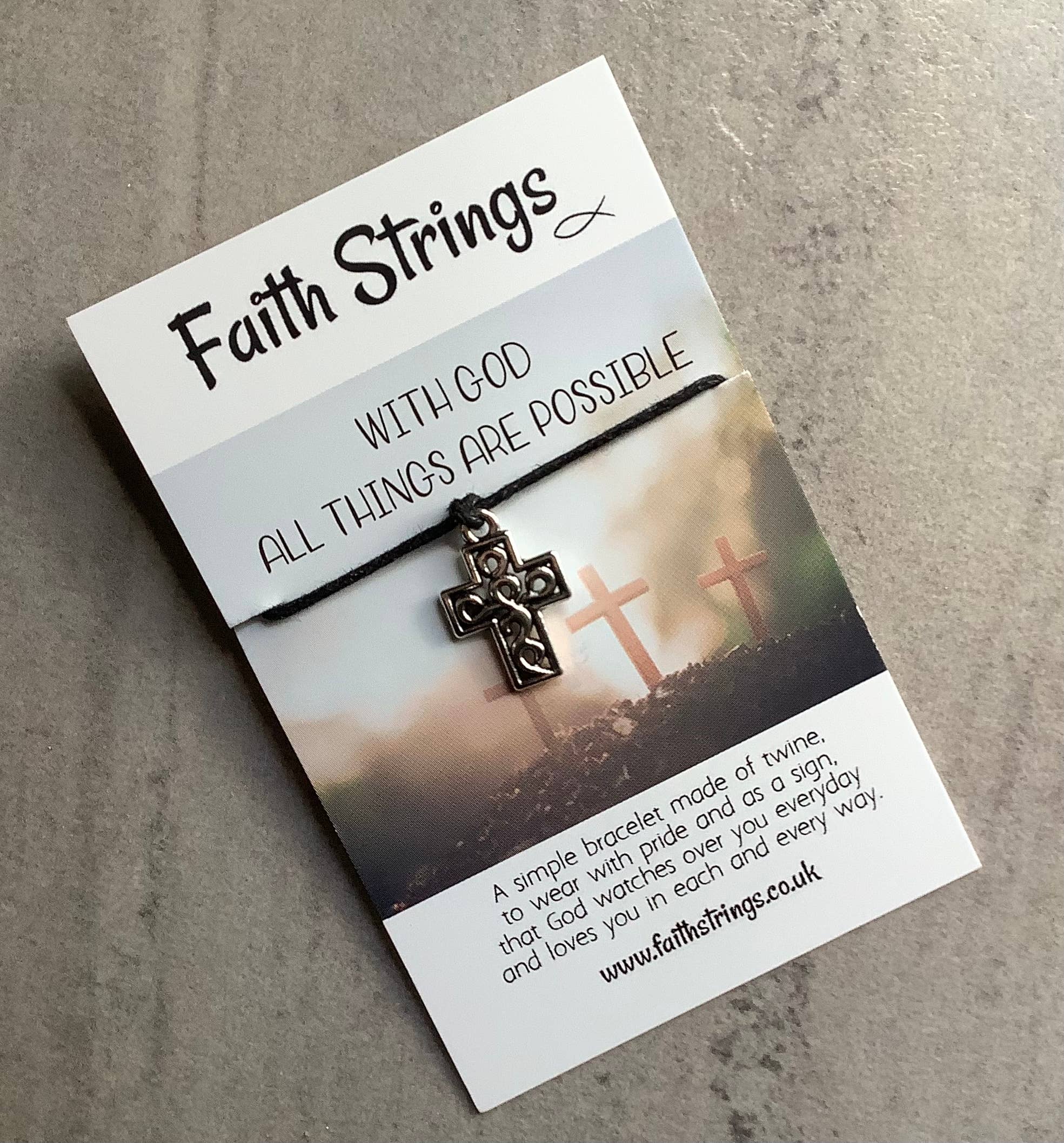 FaithStrings - "Wearing the Faith everyday" Based in South Yorkshire England, FaithStrings were developed as a result of life changing events for Ian & Jayne. Ian found himself at home with days to reflect and contemplate. He developed the concept of the FaithStrings bracelet as a modern twist to Pilgrims Tokens (a souvenir bought by a pilgrim when they visited a holy place in the 14th or 15th centuries). Faithstrings are made from 12" (30cm) of high grade waxed cotton cord. They have different charms on them and are present on cards which have different text, verses and visuals on them. They are designed to tie on the wrist or ankle and remain on until they break away. As committed Christians Ian and Jayne started making FaithStrings as presents for their friends. They felt there was a gap in the market for small Christian Gifts and soon found themselves selling FaithStrings to Cathedrals, Churches, Abbey's, Christian Bookshops and Florists. The development of the brand has connected them with many new people and has led them to visit many wonderful places of worship. Most Faithstrings products are small and light and therefore easily posted. Shipping is done at cost price, and we look for the most competitive couriers. If the shipping cost you are quoted on Faire seems expensive please message us with the quantities of products you are wanting to order, i.e. 72 Faithstrings and we will message you back with a more accurate shipping cost.
