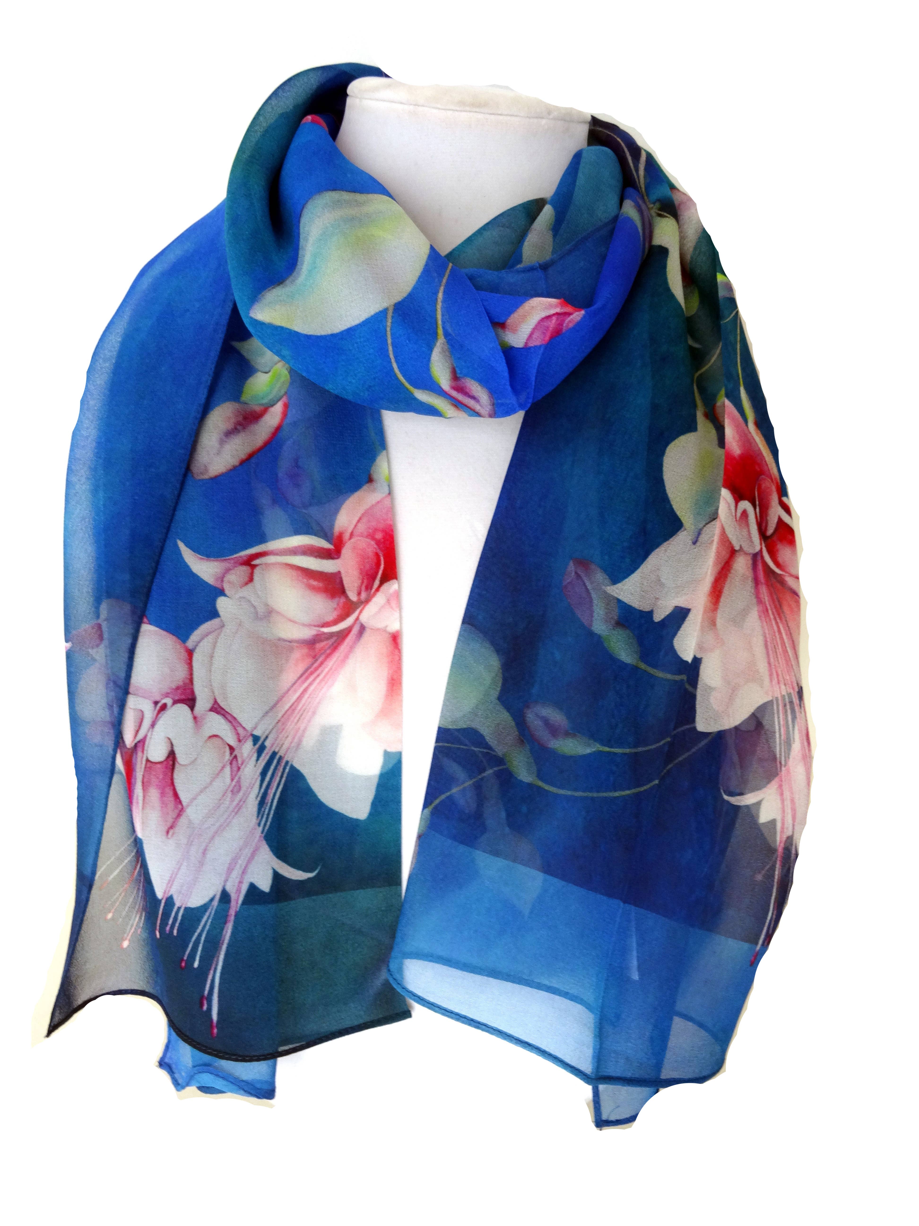 Tina Gleave is a Master Silk Painter who creates with you in mind. Her designs are inspired by her natural surroundings in Humboldt County, California, and are worn around the world. Starting with hand painting the design directly onto silk, Tina starts her process using silk dyes and squirrel-tail brushes. Once she has completed her design, it is steam-set for durability. Once she is happy with the outcome, it is photographed, then digitally printed directly onto 100% silk to become your favorite scarf or kimono or Tina uses silk georgette, silk satin, and silk twill for most of her designs. Every wearable is truly a work of art! Silk Squirrel receives yardage of the various designs, which are then cut and sewn here in the US using patterns developed by Tina. Tina is always keeping her eyes open in the fashion world to see how her paintings can complement your clothing accessories.