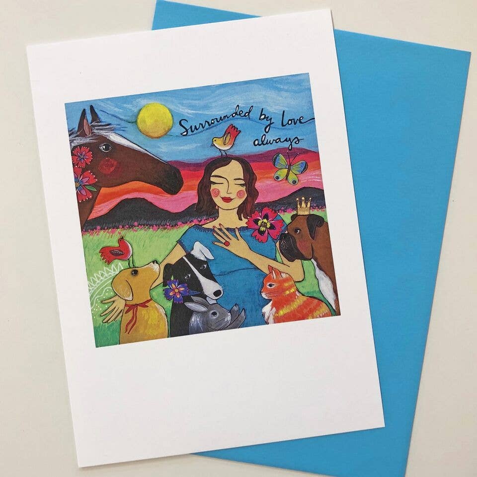 Lori Portka creates art from a daily practice of gratitude. Her paintings feature vibrant imagery and life-affirming messages dedicated to kindness, compassion, and being true to yourself. Although art was Lori’s first passion as a child, she began her career working as a teacher and counselor. Lori found her way back to creating art after a painful divorce when inspired by an online gratitude project. “I started the Hundred Thank Yous project as a way to keep gratitude front and center in my life and to refine my skills as an artist,” Lori says. “I made 100 paintings for 100 people who had an influence in my life and held a gallery show where I gave them all away.” An independent Australian filmmaker learned about her project on social media an flew to the US to film a short documentary about it called “Gratitude Grows.” A few years later the film aired on Oprah’s Super Soul Sunday. This gratitude project became the foundation for her art business and put Lori on the path to developing the kind of work that would have a significant impact in the world. Today, Lori is happily married and living in Asheville, NC with her loving husband and two matching black cats. Working out of a studio in Riverview Station in Asheville’s renown River Arts District, her space is open to the public where she enjoys meeting new people and long-time customers. You’ll find Lori’s line of art, stationary, gifts and home decor carried in hundreds of shops in the US and worldwide.