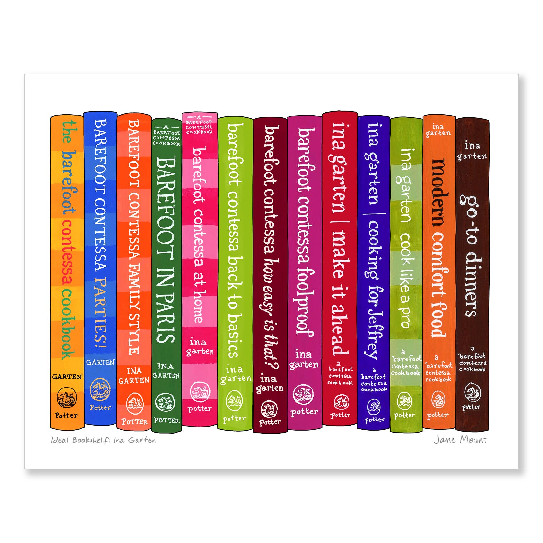 Jane Mount created Ideal Bookshelf in 2008, painting the books that made people who they are. Now she designs all sorts of bookish products for bibliophiles to show off their literary loves, including Book Pins, art prints, notecards, totebags, giftwrap, and mugs.