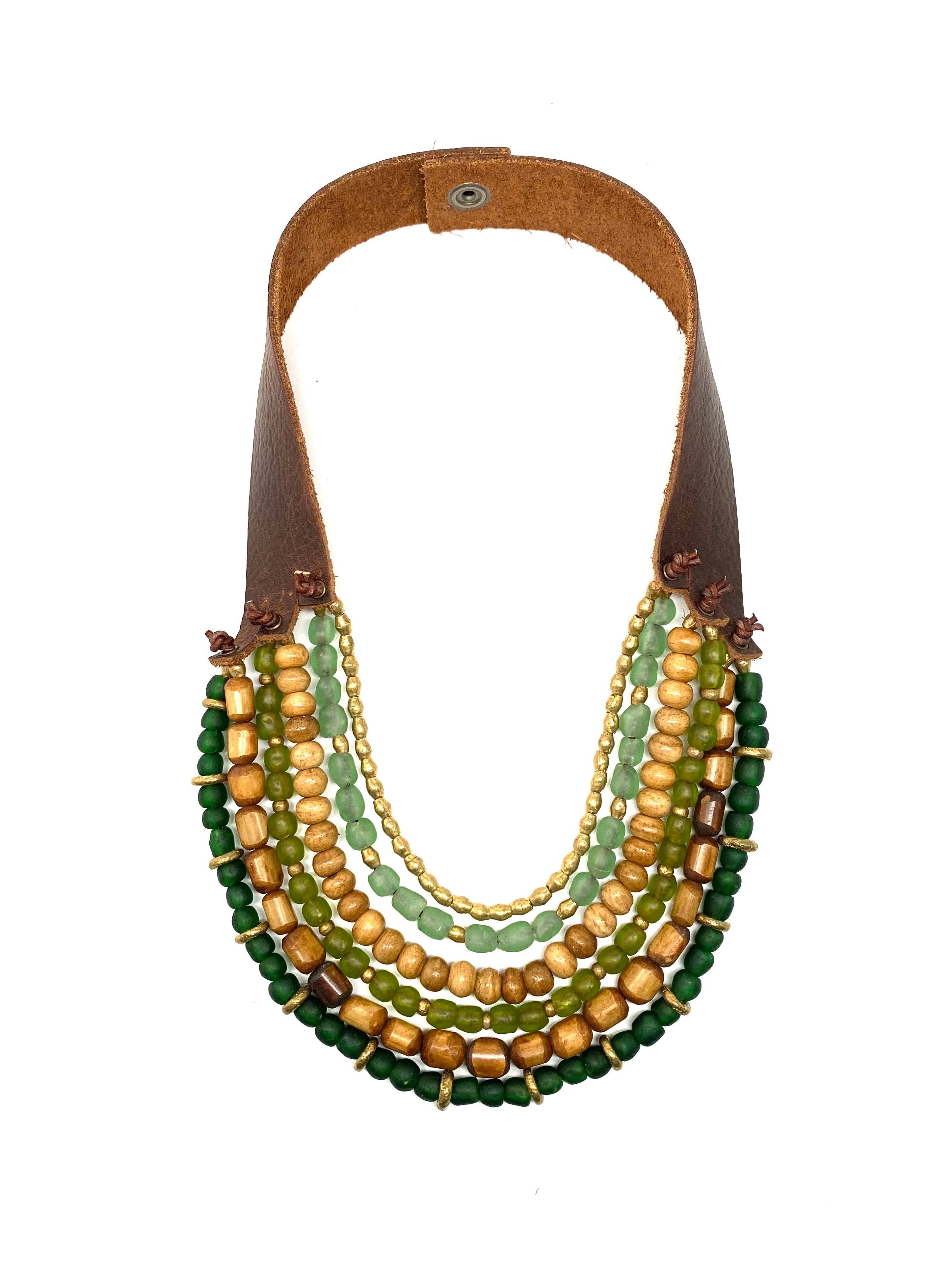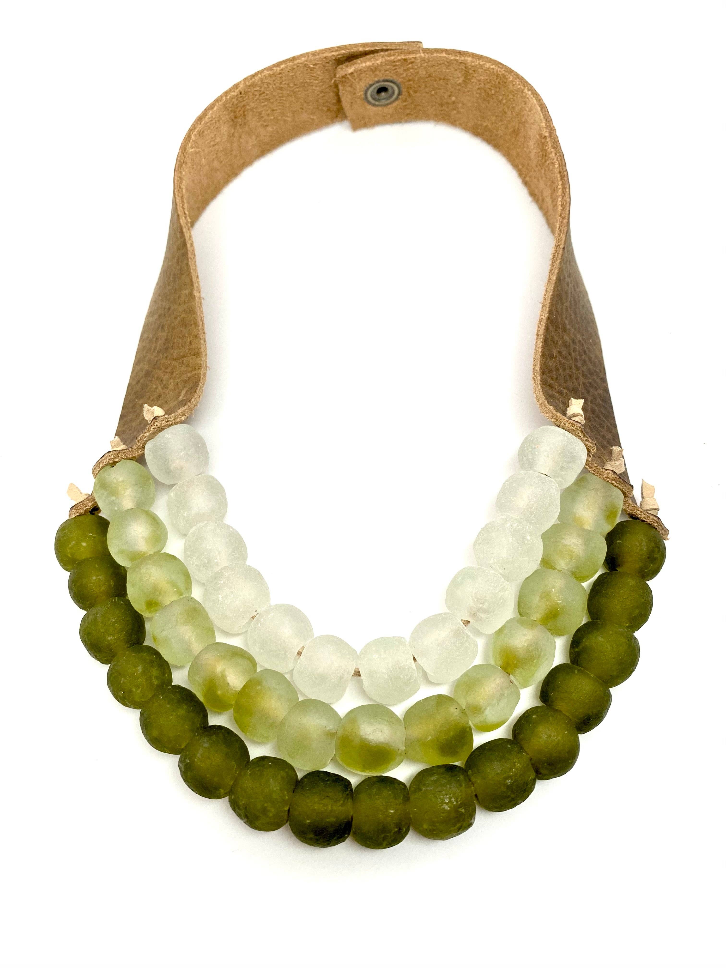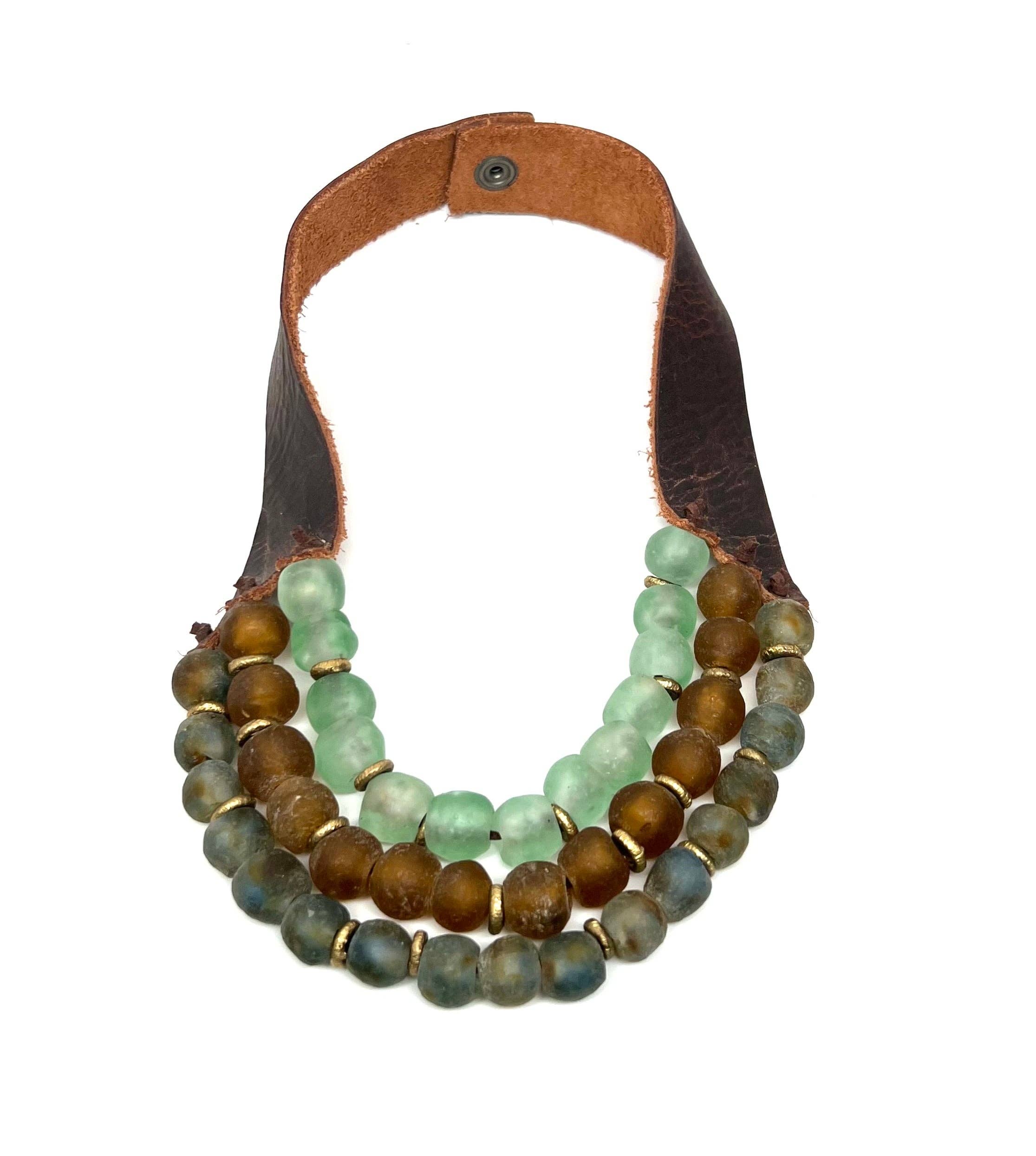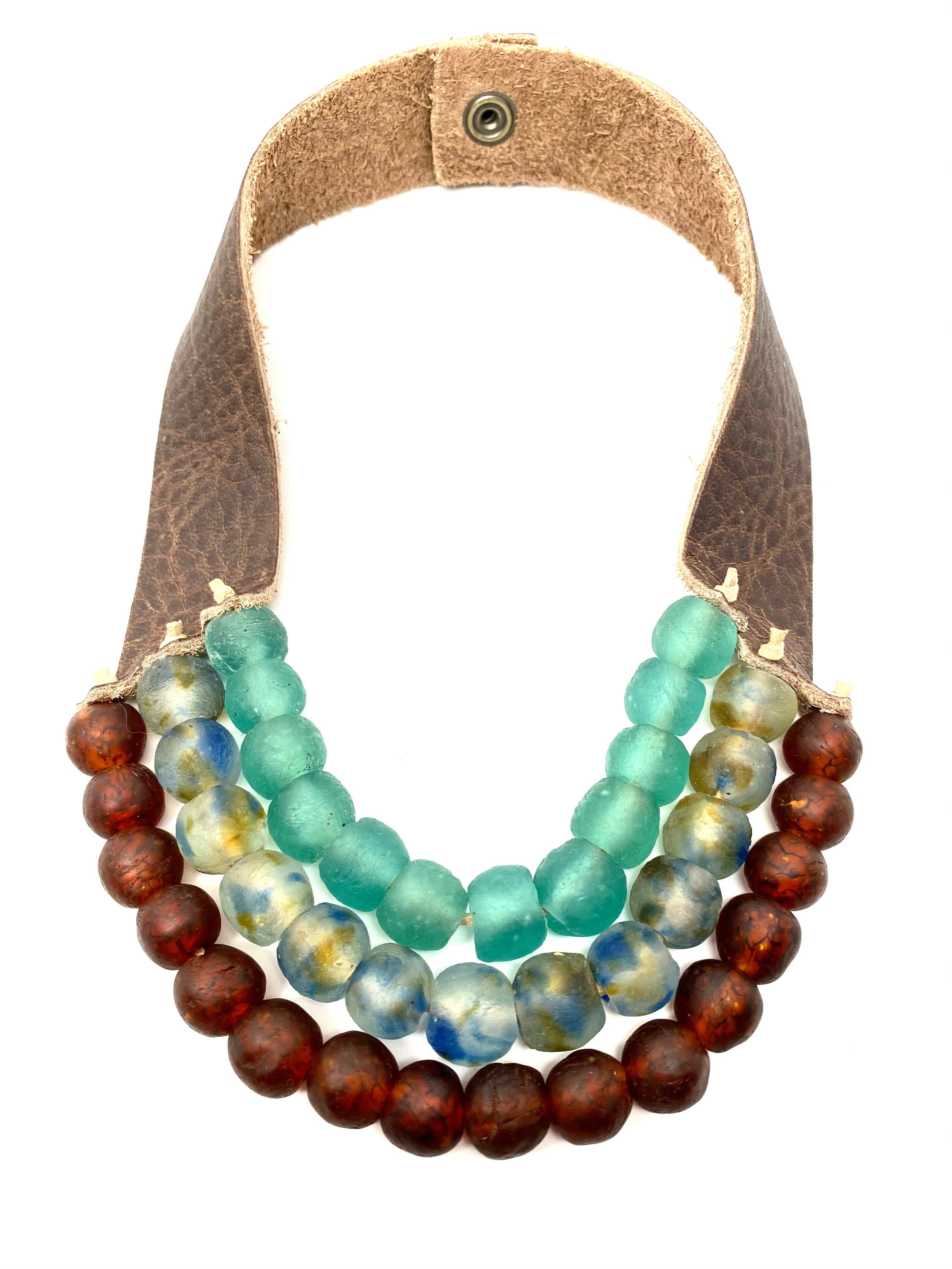 Each piece is brand new - like a new pair of shoes to break in - beadwork is woven tight, it relaxes the more you wear it. Every bead is made by hand in extremely small batches, this really makes each piece truly one of a kind. Due to the organic shape of each bead it can cause each piece to fit slightly different. Try on each bracelet to get an idea of sizing. Each piece may not be embellished exactly the same due to individual bead size. Different tribes have separate polishing techniques so the finish of each bead can vary. Over time your beads may get a natural polish sheen due to the oils in your skin. You can also, speed this process up massaging your beads with a light oil or lotion on your beads. Your leather will get more supple over time, the straps form to your neck and and like the beads, your natural skin oils will preserve the leather and age beautifully unique. Just like you! The process by which makes the beads involves heating the glass to such a high temperature it tempers the glass making it incredibly strong and hard to break. Although not impossible, I always stand behind my craftsmanship and will preform any necessary repairs should an accident occur. My leather is cut by hand, and all beadwork is done by me, Stephanie Leigh. Natural inclusions may occur in all handmade and recycled components. Beads are sourced fair-trade from Ghana. Leather is ethically sourced from furniture scrap remnants. Handmade Sustainable