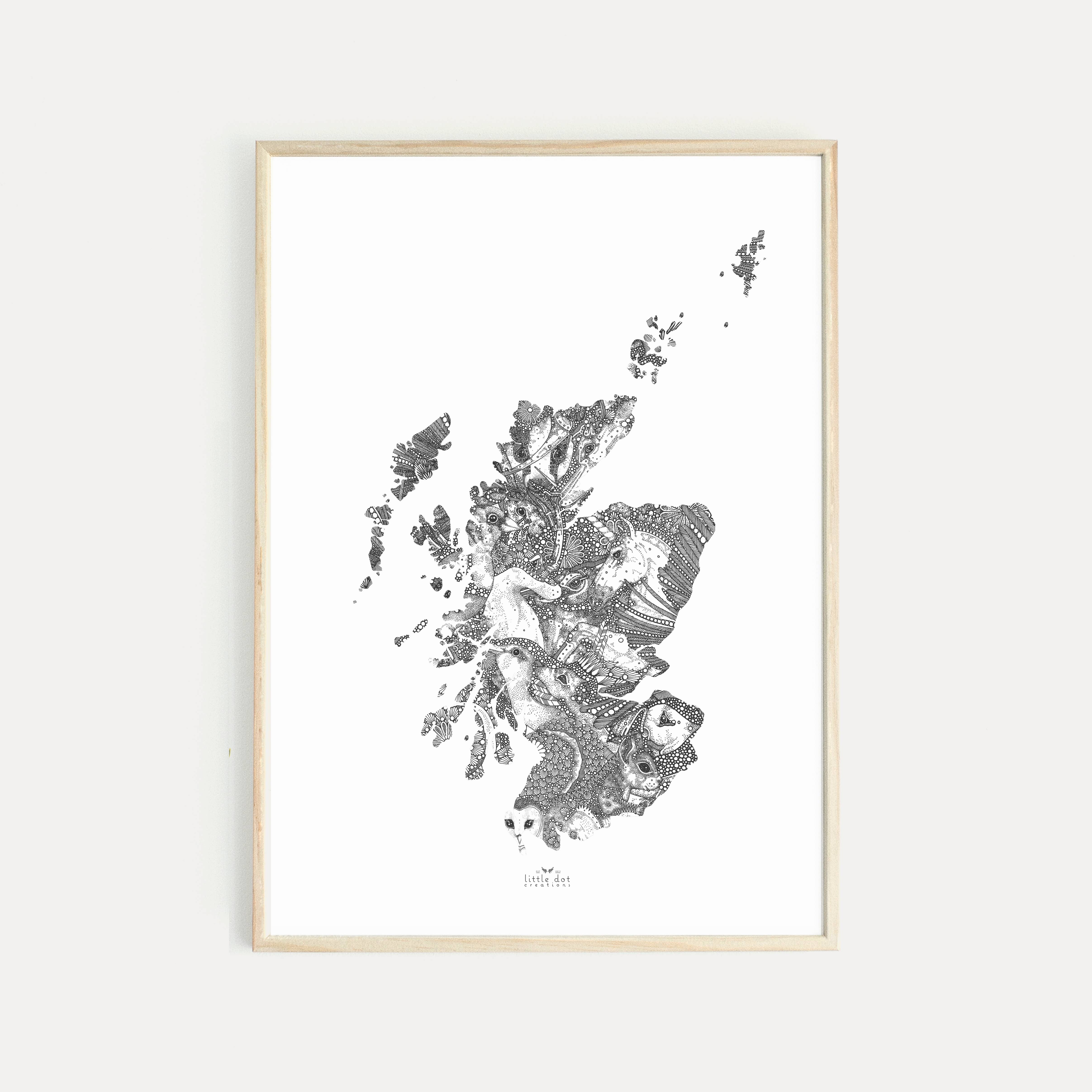 Little Dot Creations was established in 2013, offering a wide range of light-hearted animal treats for adults and children alike. Armed with her tiny pens, Suzi creates her illustrations using thousands of little dots and circles. Designing prints, homewares and greeting cards, everything is handmade in her Little Dot Studio Shop. She draws inspiration from her love of children’s stories, fairy tales and life growing up in rural Dumfries and Galloway.