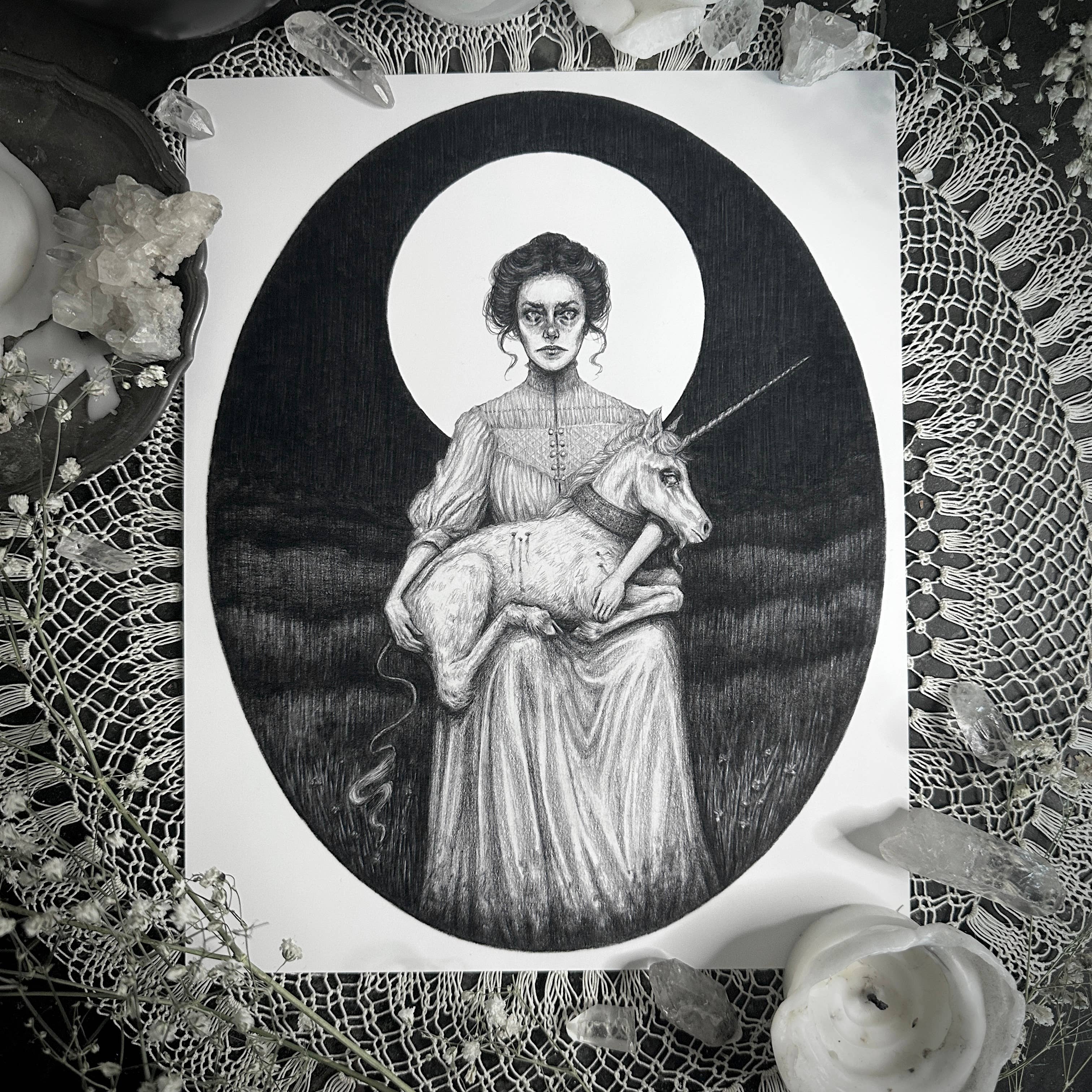 Caitlin McCarthy is an artist and illustrator currently living in Northern California. Since a young age Caitlin has been interested in magic and using art as a tool to explore it. Her work often features visions of dark dreamy women in the form of seers, goddesses, mystics, and witches. Channeling her fascination of Victorian sensibilities and the occult, her drawings invoke feelings of melancholy, and create an eerie, otherworldly atmosphere. Caitlin’s preferred medium is graphite on paper. She is the creator of The Dark Goddesses Oracle Deck. All of Caitlin's fine art prints are made in-house on quality archival matte paper and each order is put together and shipped with love and care.