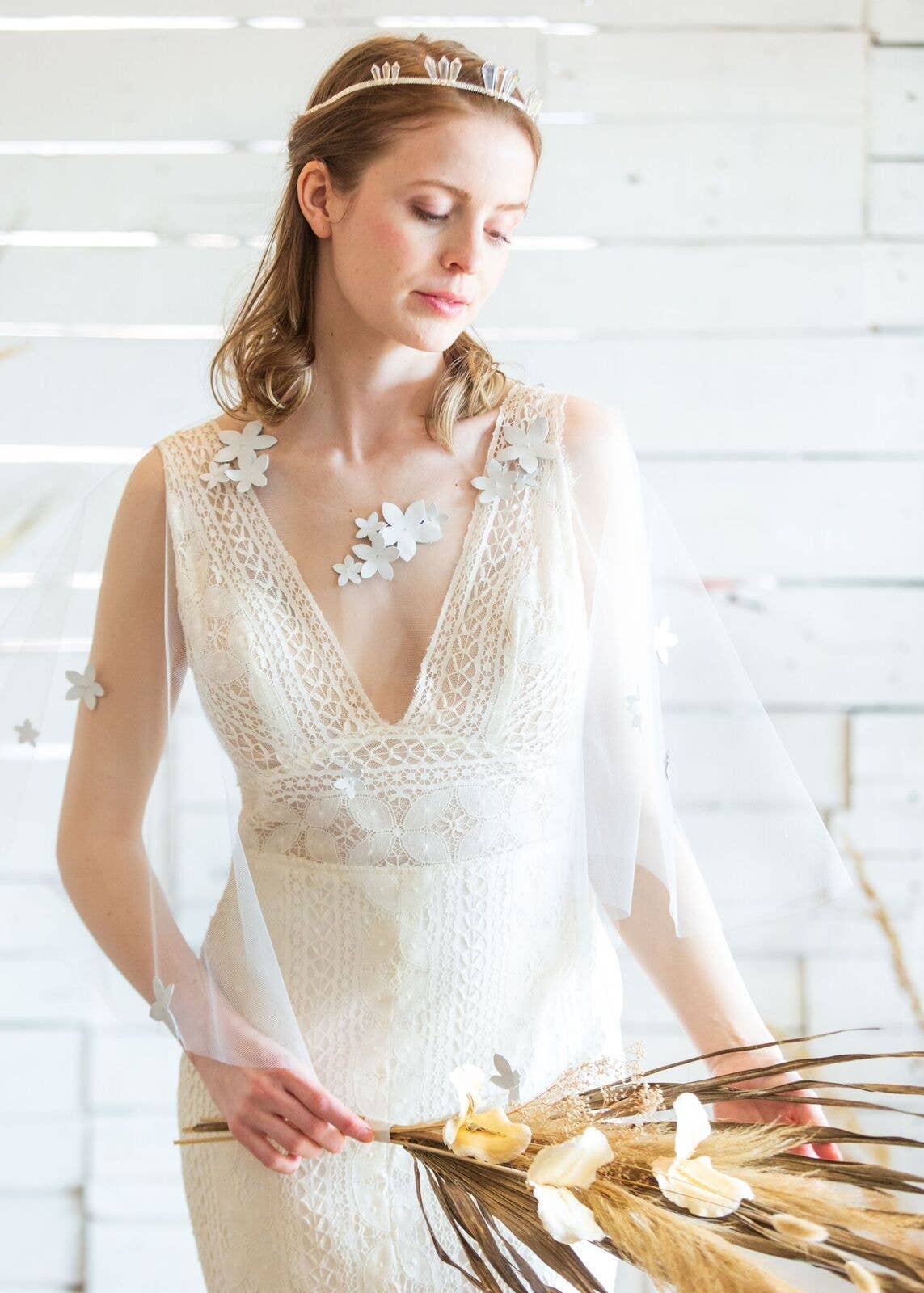 Alyson Nicole started out as a small line of bridal veils and avant-garde head pieces. Shortly after attending a bridal fair in Pennsylvania, Alyson started working closely with clients and bridal boutiques creating custom veils and bridesmaids hair accessories. Along with brides and private customers, she also worked closely with colleges to create one-of-a-kind millinery pieces to complement students’ designs during their annual fashion show. Three years later, after getting situated in Brooklyn, NY, Alyson decided to relaunch her brand to include an array of accessories that catered to a more non-traditional bold bride, along with bespoke services for accessories and wedding gowns. Alyson takes pride in hand crafting each product in her Brooklyn studio. She loves to create components and products from scratch to make them truly unique. From the hand beaded embellishments, to the hand curled feathers, all the way to the fabric logo tags; Alyson’s hand made products are done so with care and passion. Materials are hand selected based on quality and aesthetics to build a line of accessories that mix natural elements with industrial aspects, creating a beautiful juxtaposition for unconventional brides.