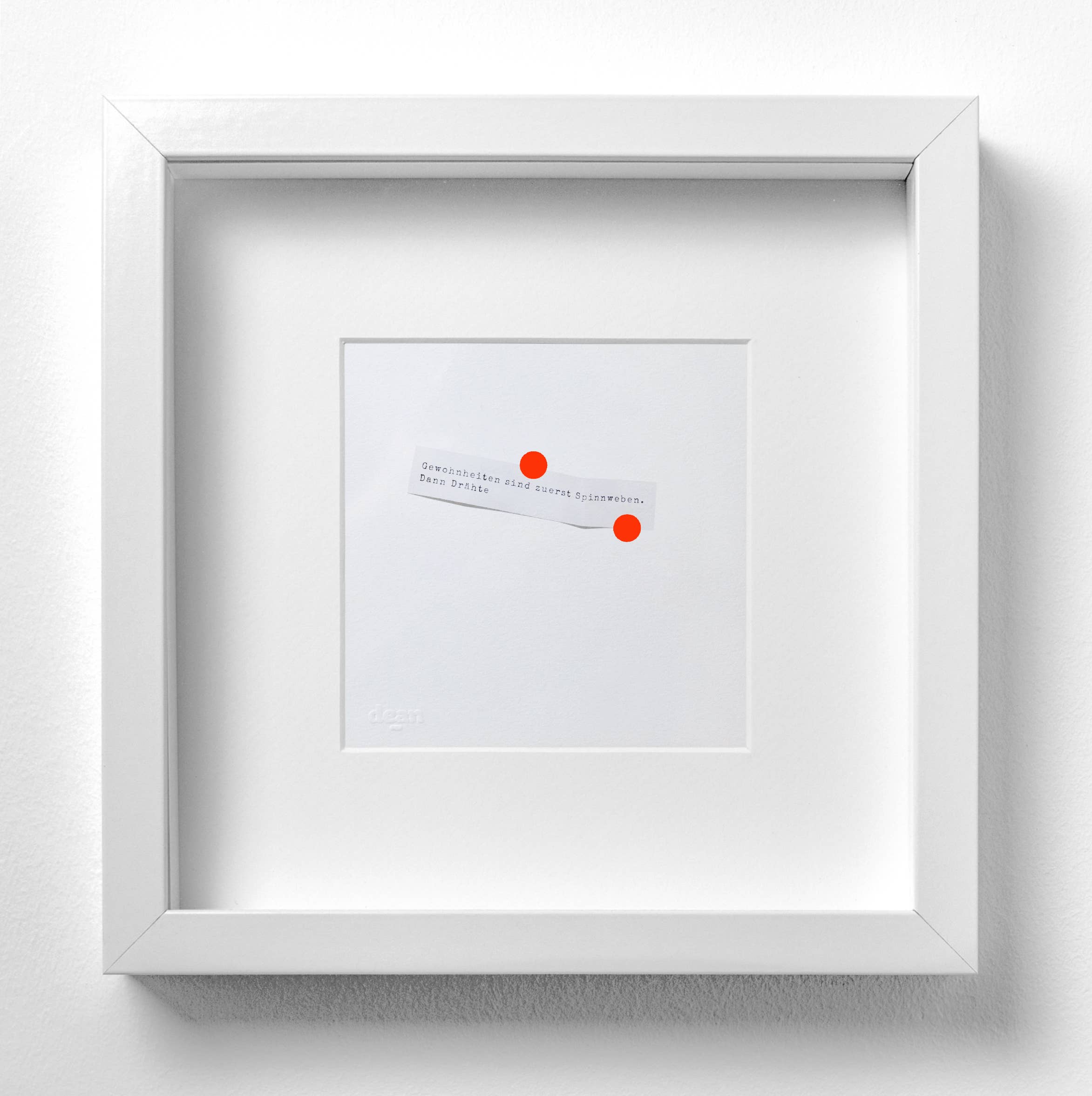 dean.one are fine art pictures measuring 25 × 25 cm. With fortune cookie messages, Pantone stories, texts, screen prints and risographies. Whether as a single picture or the whole wall, Dean.one refreshes and revives every room. Mostly discreet, sometimes very loud. And neon-colored bags made of fabric complete the range.
