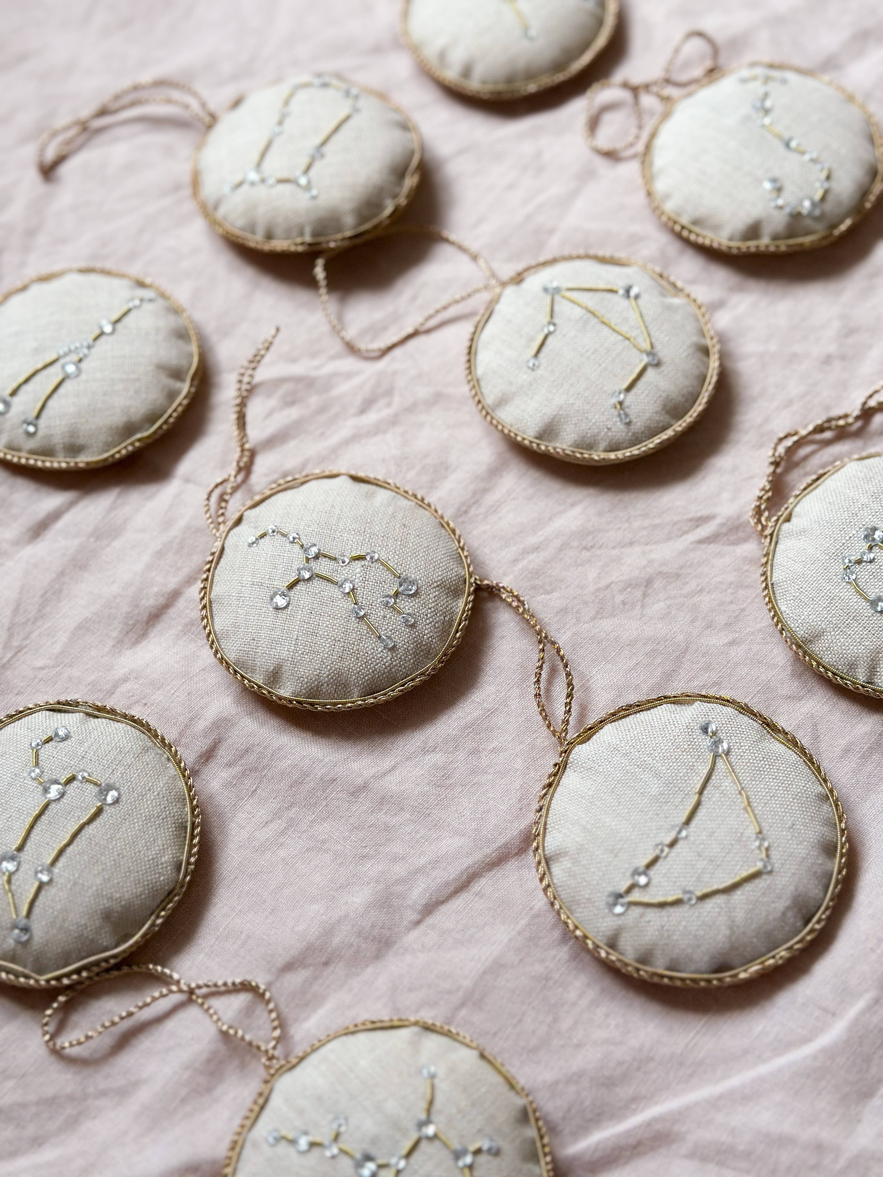 Katie Larmour, designer and founder: Irish linen has always been around me, from my childhood in Ireland right through to the present day, from unknowingly sitting on an old spinning stool as a child in my grandmother’s house to eating off her intricately patterned damask tablecloth.Growing up I could see a host of huge linen mills and factory chimneys across the city skyline. Today our studio is based in Belfast and we ship our luxury Irish Linen all over the world. Made from the flax plant, Irish Linen is also an eco-friendly, sustainable alternative to fabrics that use fertilisers and pesticides, it needs little water and the whole plant is used making it a waste free crop - basically grown as a weed it is transformed into utterly beautiful premium cloth. These unique festive ornaments and souvenirs are made in a mixture of countries, and that’s what makes them unique. As our brand has grown we have outsourced some of our making. For clarification these little beauties are a combination of the following: Irish fabric (a mixture of recycled off cuts from our cushion making, local mill deadstock, vintage finds and repurposed antique tablecloths and napkins found in local auction houses), some organic batches, designed in Northern Ireland by artist Katie Larmour (original and copyrighted), hand embroidered in India using a traditional zari technique by a small team of selected artisan makers who we work closely with, then finished and packaged in Ireland. Ethically made.