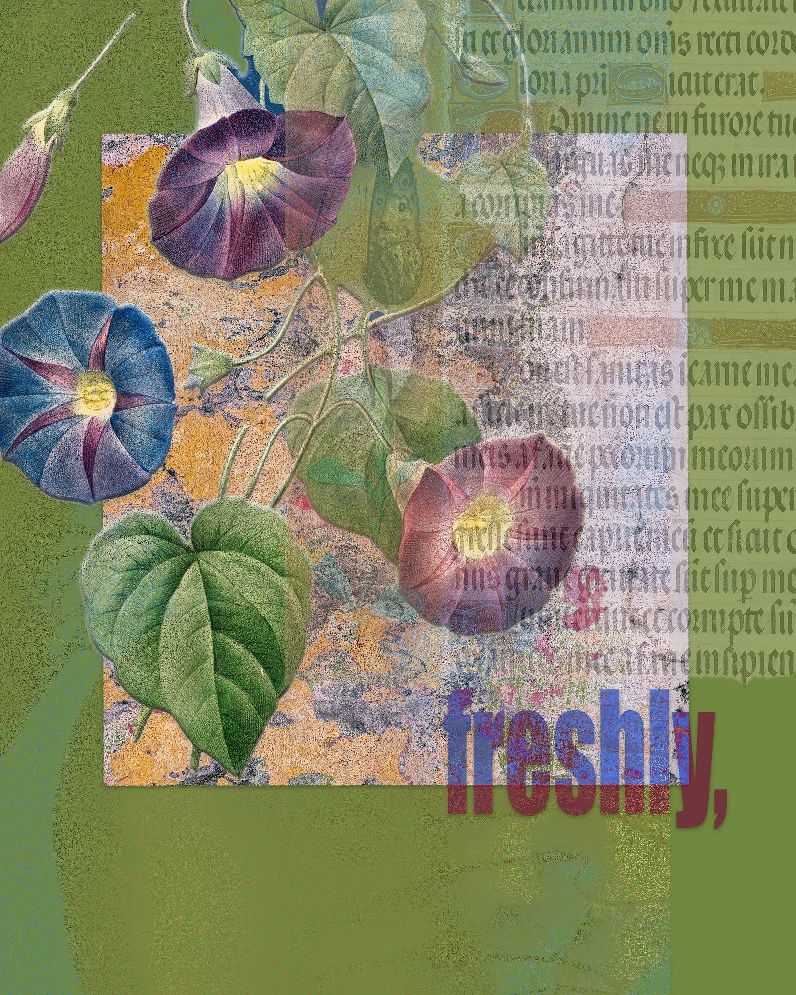 Katie Conway McGlade is an artist who loves a good story and enjoys an inspiring museum crawl. Her montages sprout from oddities found in the natural world, archival imagery sourced from the public domain, and by everyday surprises. She can often be found wandering the globe, sharing a cuppa, and learning something new. VivaTheCirce was born out of the desire to bring art out of the museum and into the real world. For eons art has had the power to spark the imagination and create unexpected connections. The "Adverbly" series brings together images from the public sphere and personal photographs then slips adverbial modifiers into the mashup, leading the imagination somewhere new. Pick a piece whose adverb, color or imagery inspires you to write a special message in a card or add intrigue to your living or work space.