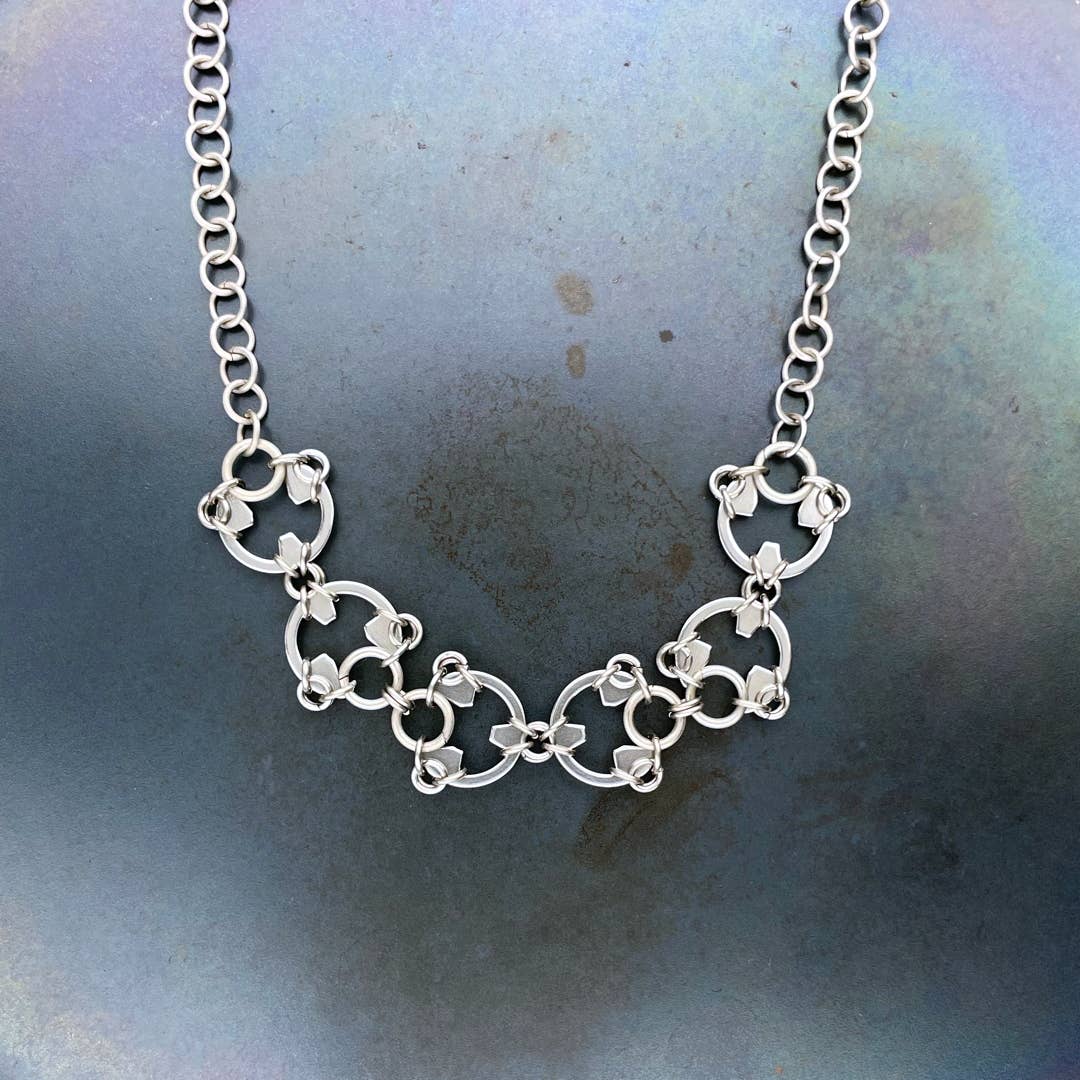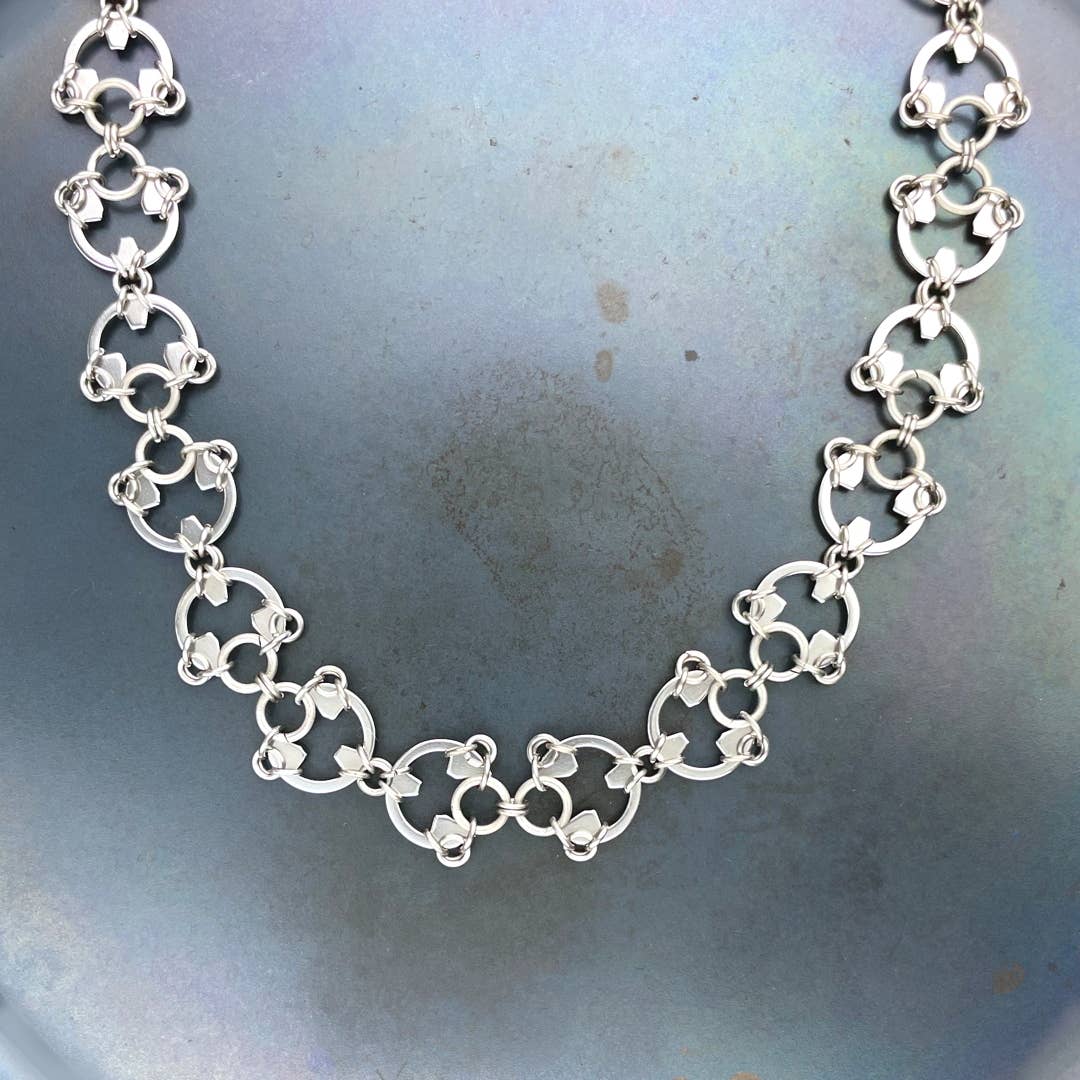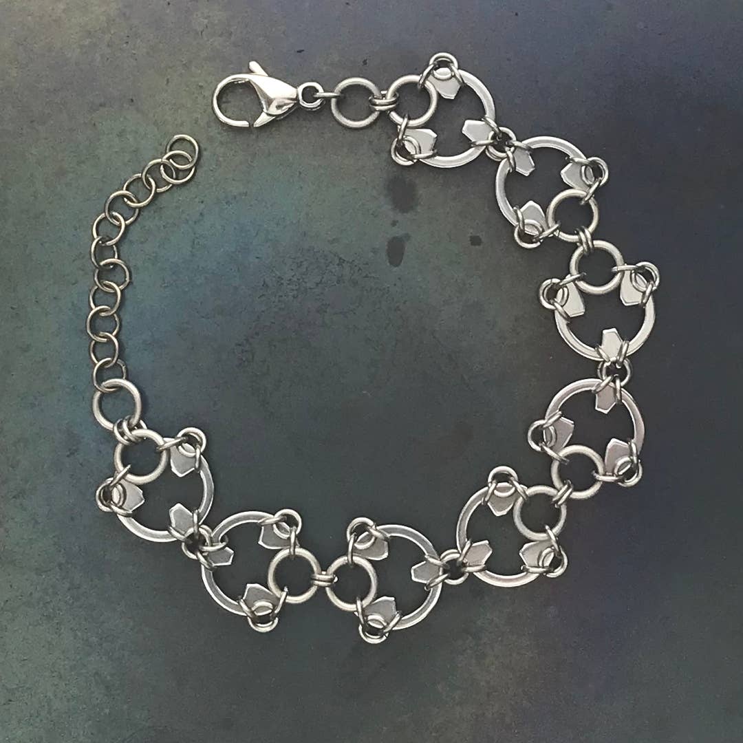 Designer/maker Kelly Jones of Wraptillion creates polished modern jewelry that's classic yet edgy. Look closer -- it's made from stainless steel hardware that's used in car transmissions, airplane hydraulics, motorcycle hubs, and more. The intricate patterns are created with titanium links, chainmaille techniques, patience, and some creative engineering. These lightweight designs are favorites with men buying gifts and women who want something striking yet easy to wear. From classic linked circles to lush abstract florals, Kelly makes each piece by hand in her studio near Seattle, Washington.