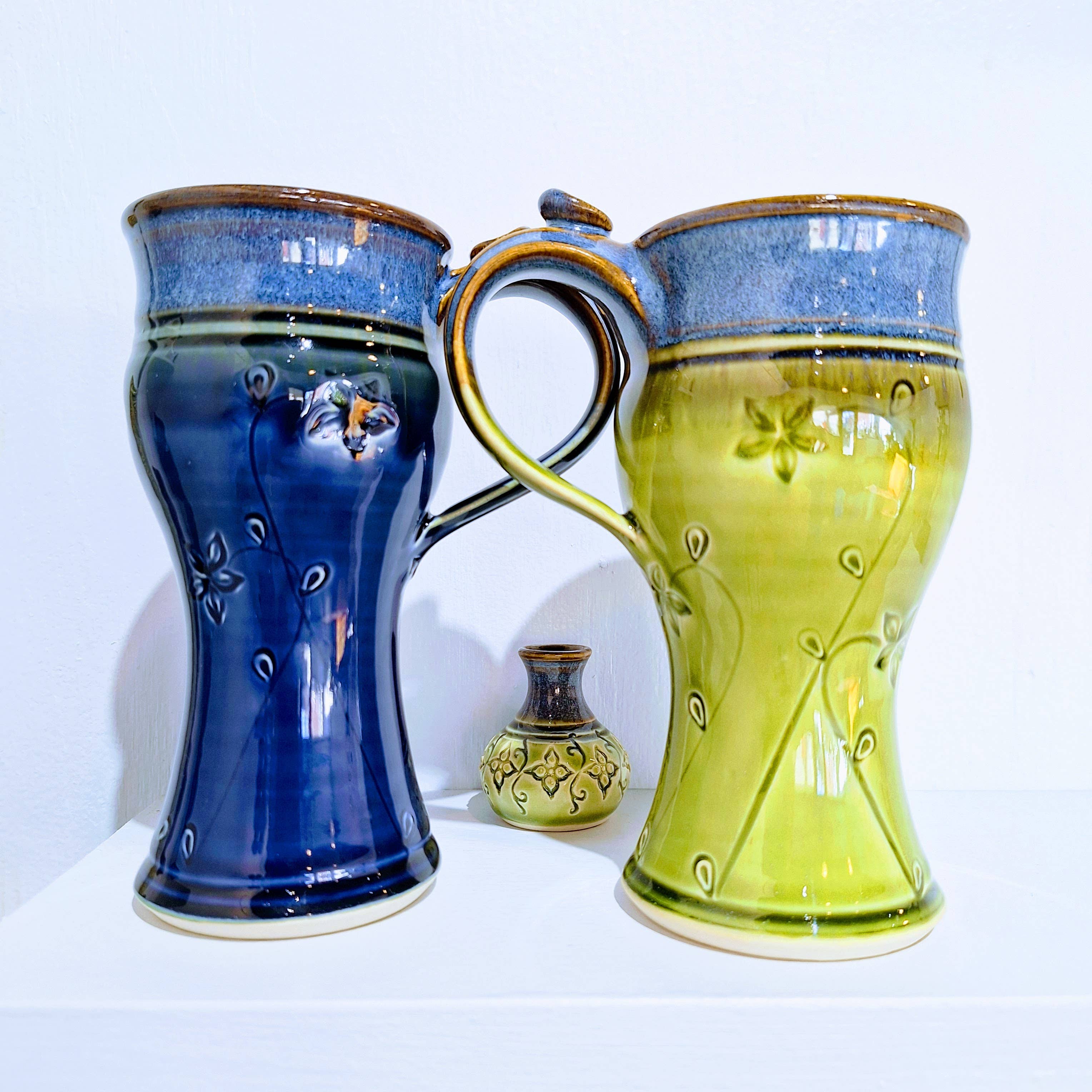 My gallery and studio are located in Asheville, NC, where I pour my passion into creating pottery. One of the most frequently asked questions is how did I become interested in pottery? There wasn’t a specific beginning—it was simply a way of life growing up, surrounded by handmade objects. But if you’re asking when I knew I wanted to become a potter, that moment came while helping my dad, master chair maker and blacksmith Lyle Wheeler, at a craft show in Banner Elk, NC. North Carolina heritage potters Glen and Lula Bolick were there, demonstrating on a kick wheel outside. I was captivated! I spent hours watching Lula, completely mesmerized. Eventually, she invited me to touch the pot she was shaping. The moment my finger slid across the clay, I felt a spark in my soul—I knew I wanted to make pottery. That moment set me on the path I’ve been crafting ever since. In today’s busy, tech-filled world, I believe pottery grounds us, reconnecting us to the present moment. Using a handmade mug or bowl becomes an act of mindfulness, a small ritual in our daily lives. I design and use my own small handmade stamps to create intricate, one-of-a-kind patterns that no other potter has. Each piece is thoughtfully crafted, with small details—like decorated bottoms and embellished mug handles—designed to elevate the experience of using my pottery. These thoughtful touches create an intimate and beautiful connection with every item I make, transforming everyday moments into something