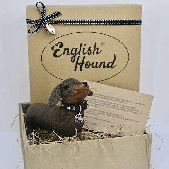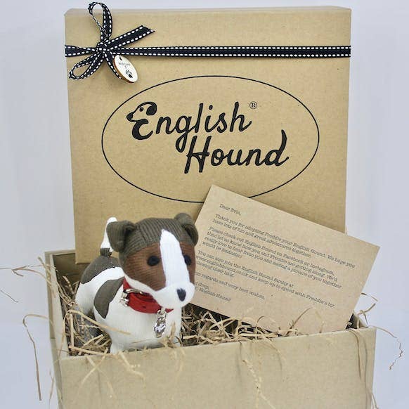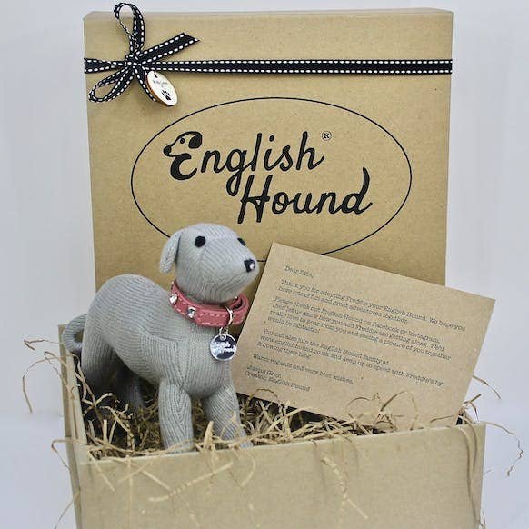 English Hound - Unique gifts for dogs and dog lovers I've always loved dogs and I started English Hound so that I could capture the simple joy of owning a dog as a wonderful gift. They are beautifully knitted doggies that are true likenesses of the 11 most popular breeds, in wool. We sell them in 2 ways: As a dog toy - this is the knitted hound on its own. The soft feel encourages dogs to carry the toy in their mouth rather than chew it. We get 5 star feedback on Etsy that our hounds are fabulous toys for a much loved pet. As a unique gift for a dog lover - each knitted hound comes with a beautiful leather collar, English Hound name tag, adoption certificate and flat pack gift box. It makes a unique gift for dog lovers, whether they are a dog mad owner or someone too busy to own a dog and this is the next best thing.