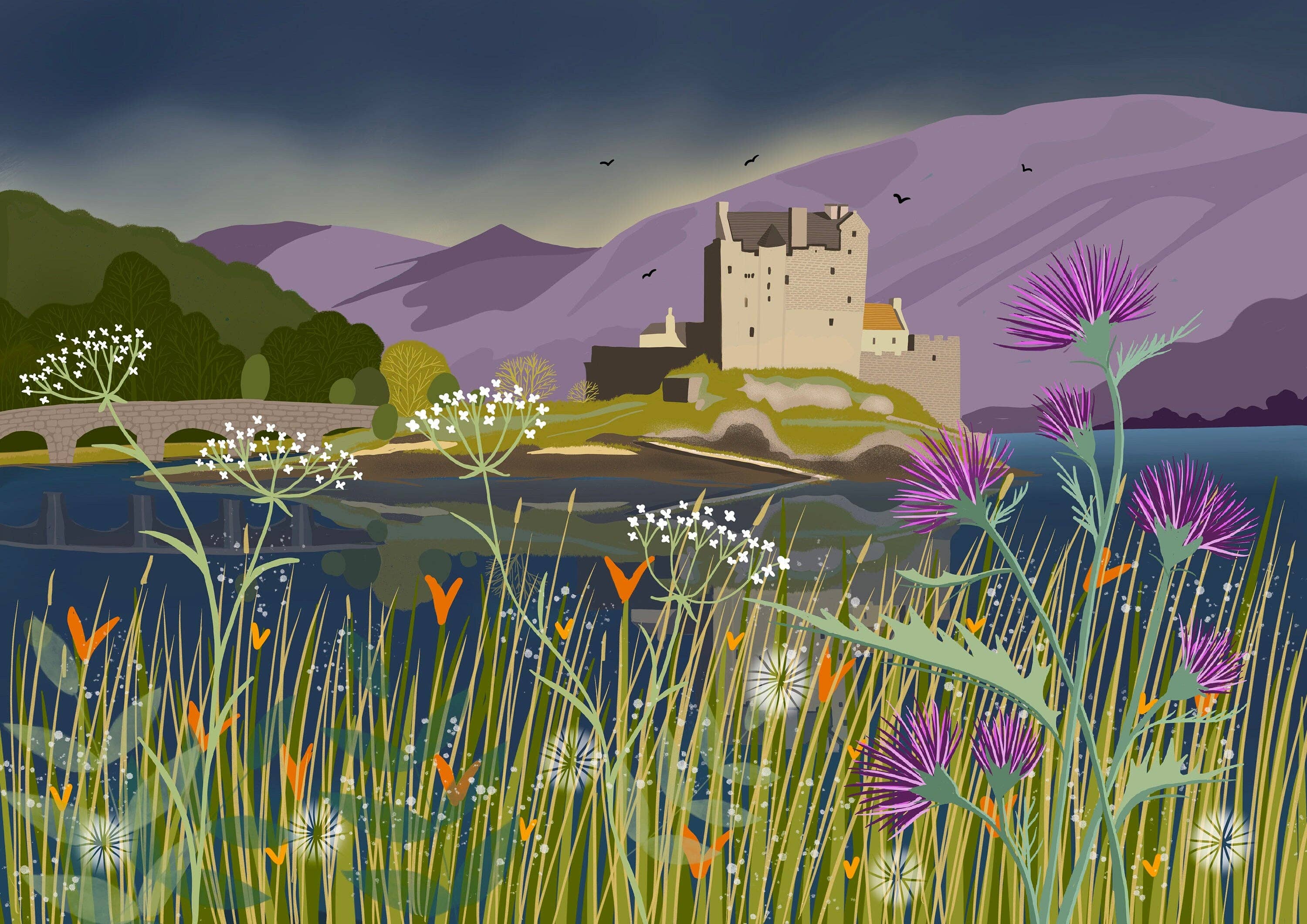 Welcome to my shop and thank you for looking. All my work is designed and printed by me in my studio in rural southwest Scotland. My art is inspired by the landscapes and nature of Galloway. Think green fields, wildflowers, pretty cottages and wildlife. The British countryside at it's very best. I did an Art Foundation course then trained as a Graphic Designer in the early ’80s and have worked as a Graphic Designer for over 35 years. In 2014 we relocated to South-West Scotland where the landscapes of Galloway inspired me to return to art. I now work as a full-time artist and illustrator and love to create bright colourful images showcasing the coast, hills, forests and wildlife of Scotland.