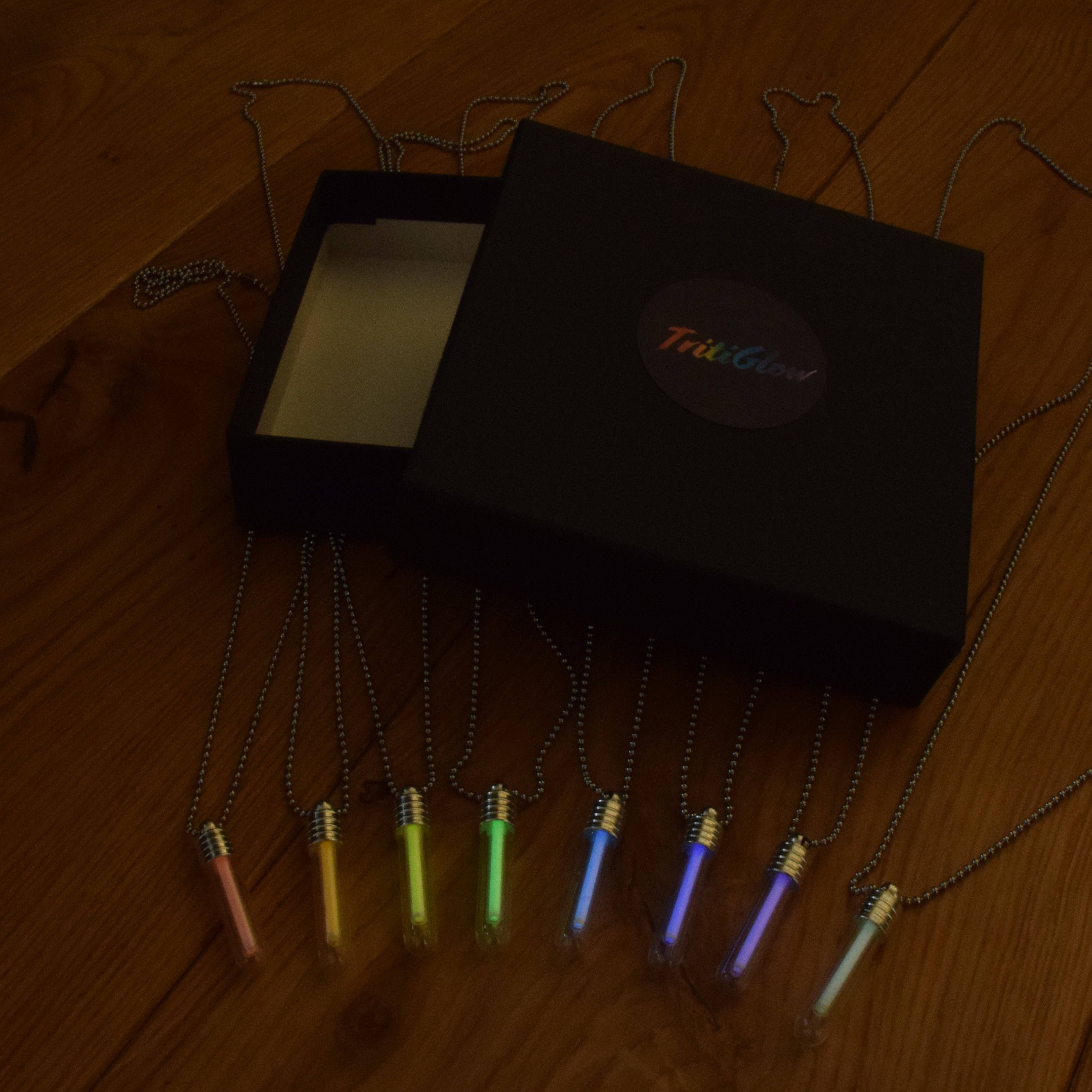 TritiGlow produce necklaces that glow for decades without any energy requirement or need to charge / maintenance. They do so by harnessing Tritium gas. Tritium has a half-life of 12.3 years, meaning after 12.3 years the pendant will glow half as bright, and after 24.6 years will glow a quarter as bright. Tritium costs $30,000 per gram, putting it in the top 10 most expensive materials in the world (obviously it's in gaseous form in our pendants). It also has a half-life of 12.3 years, meaning after 12.3 years the pendant will glow half as bright, and after 24.6 years will glow a quarter as bright.