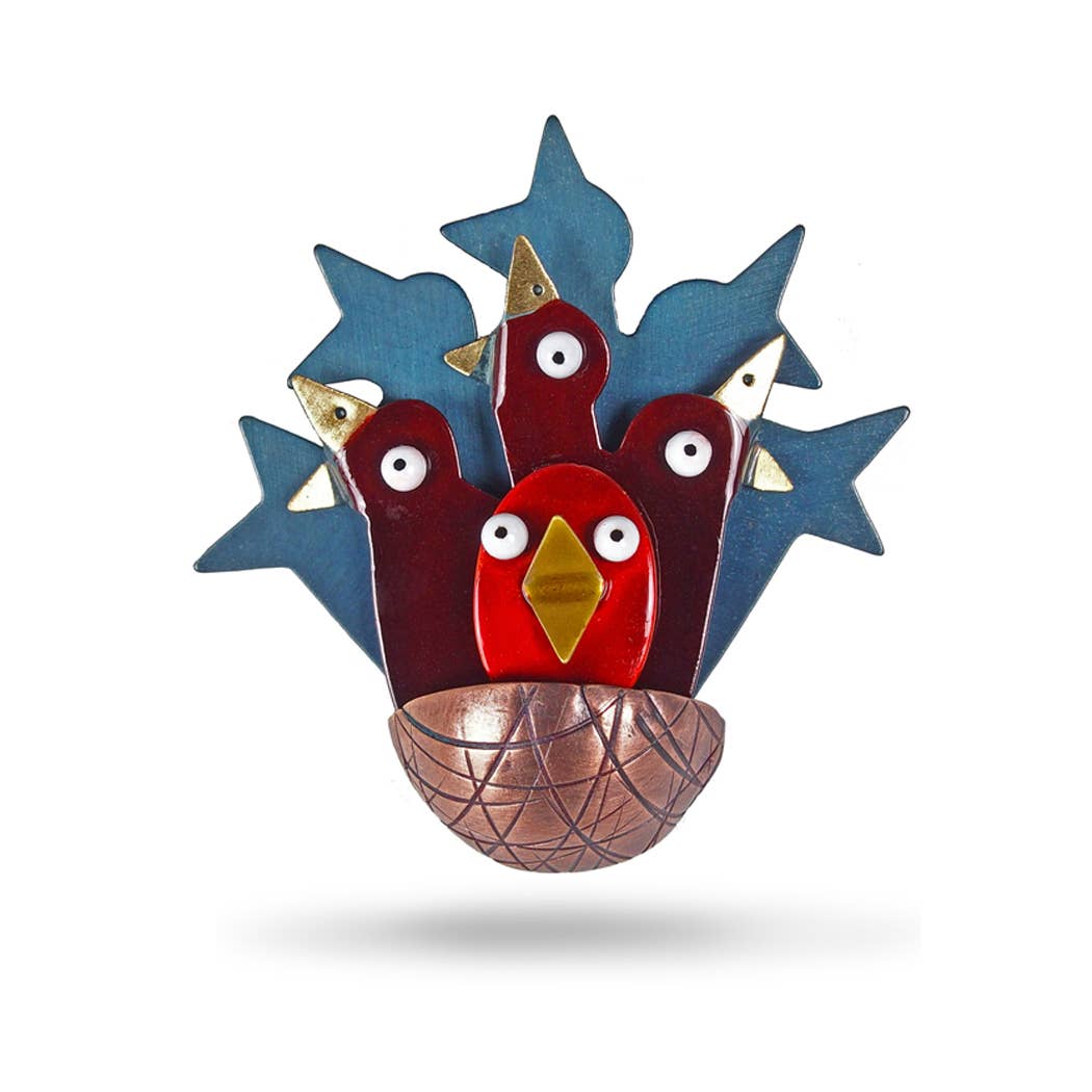 Our story began at Tyler School of Art in Philadelphia in 1984, where we met and fell in love. In 1988 we decided to pool our talents and created CHICKENSCRATCH. Our goal was to make meaningful and well-crafted jewelry that was collectible, affordable, and accessible. A whimsical and narrative nature was, and remains, a central theme in our work 37 years later. ` Since the beginning, we have been creating our work almost entirely by hand using thin-gauge sheared brass sheet and wire, our own invented patination process, and colorful enamel paints and leaf. Other materials and processes have entered the picture – found objects, epoxy resin, plastics, castings – but regardless of the materials and the processes, we have remained true to our original intent. We have consistently and creatively navigated four decades to bring smiles to peoples’ faces and joy to their hearts. Our work continues to be completely handmade by the two of us in our Maine studio. We still love what we do and feel that our love of making shows through in our work. Chickenscratch is an absolute original made for people with the same joy that we bring to its making.