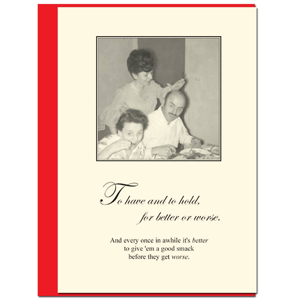 Bloodshot Press was originally created by screenwriter Alicia Gronke. Alicia desperately turned to writing when her kids were on a particularly neurotic spree during Spring Break 2002. They were bored and doing the usual sibling thing: "She's LOOKING at me!" "He's pulling my HAIR!" Alicia could have followed the advice of any number of parenting books and made an attempt to mediate their dispute. Fortunately, she instead chose to tune them out and start writing. The sarcastic, occasionally bitter, often emotional results were the first Bloodshot cards. Alicia took these fruits of her labors to a local card shop. The owner took a long look. Her response? "What took you so damn long?!" In 2010, Mackenzie Jeans, owner of fellow card company Allport Editions and friend of Alicia, adopted Bloodshot Press. Since then “BS” has become known as the naughty little sister of the Allport Editions family. Using mostly family photos and a few dashes of wry wit, Bloodshot your go-to line for wicked humor. As Alicia always says: “laughter is contagious—infect someone today!”