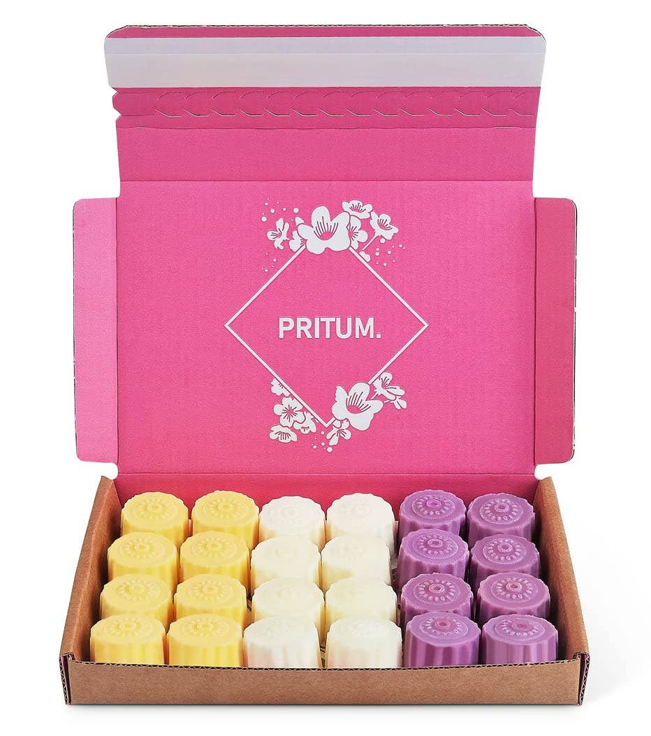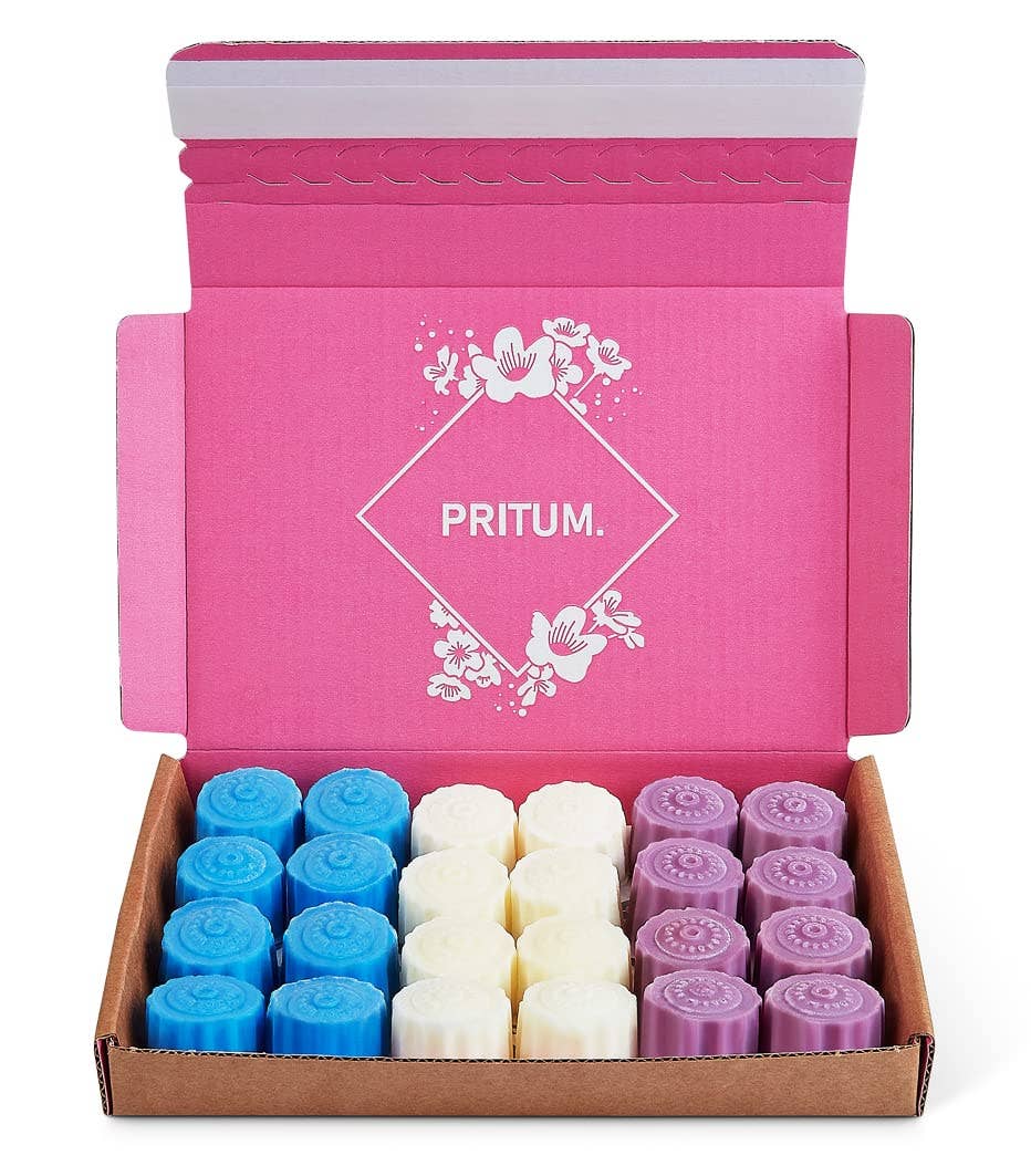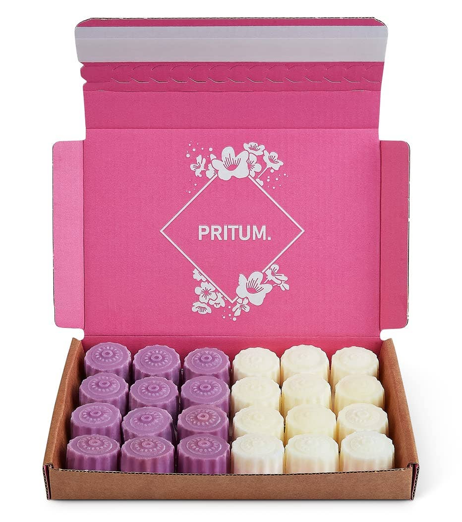 At PRITUM. we strive for high quality and design. Soy melts have been a popular choice for wax melts historically, however with our vegetable wax blend, we have achieved an excellent scent throw which we hope you will love. o 100% Recyclable Gift Box And Packaging. Perfect As Present. Using cardboard and papers, we are plastic free whilst still giving a high-end polished product. o Delivered In A Gift Box Which Can Be Used For Storage. Perfect for storage taking minimum space, there is no need to remove from the box, saving you the cost of wax melt jar holders. Box and melt colours may differ from image. o Orders Designed To Fit Through Your Letterbox. We have purposely designed our gift box to fit through the UK standard letterboxes making it easier for customers to receive single orders. o Made From Vegetable Wax Giving Excellent Scent Throw Moving away for traditional Soy and Paraffin wax, PRITUM. used a coconut & rapeseed blend which is vegan friendly. We selected this wax as we find it gives an excellent cold and hot scent throw.