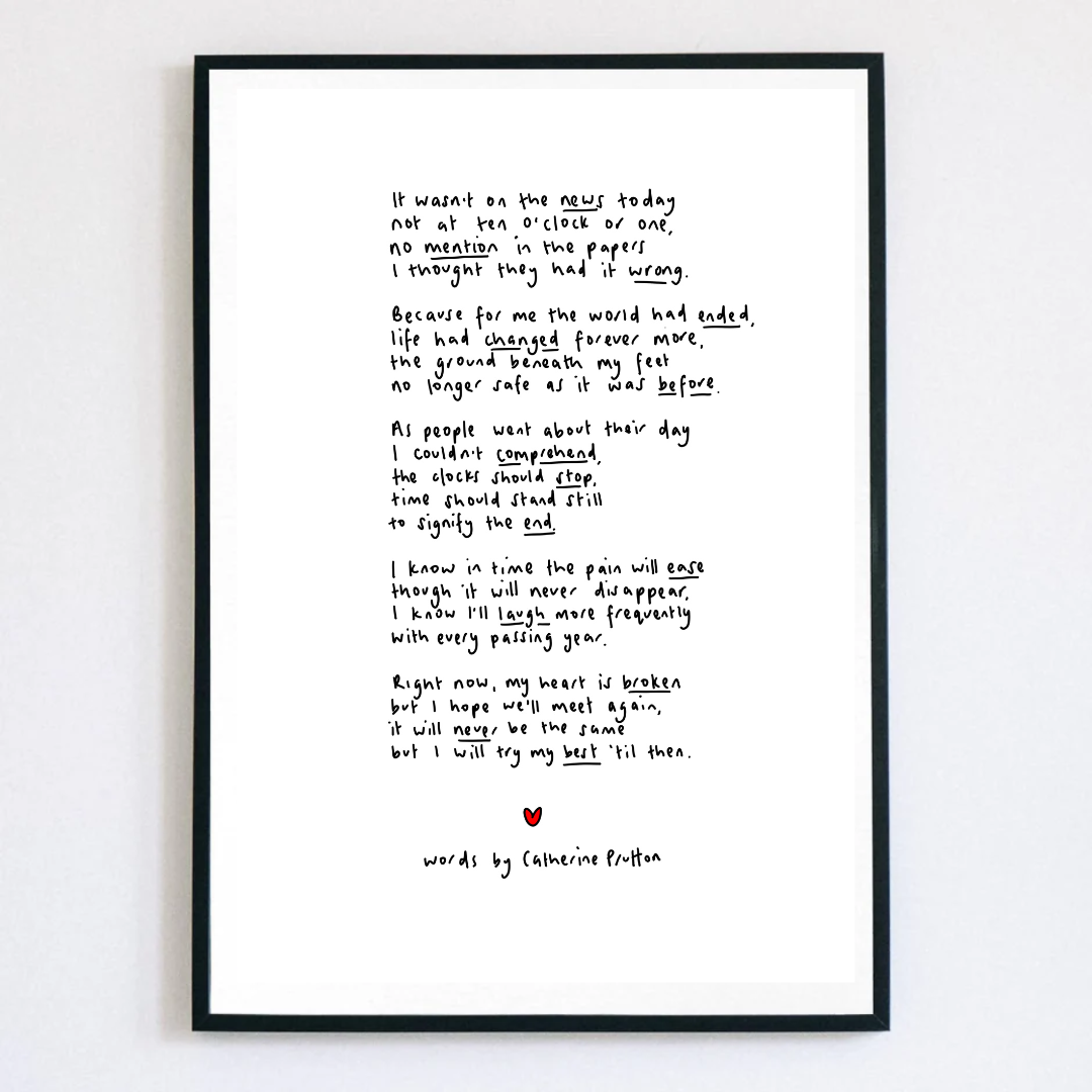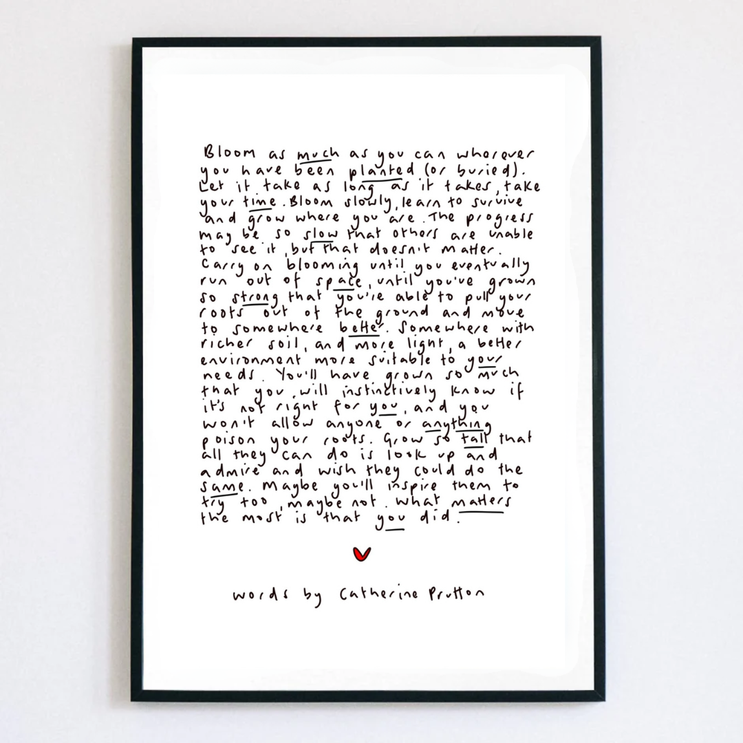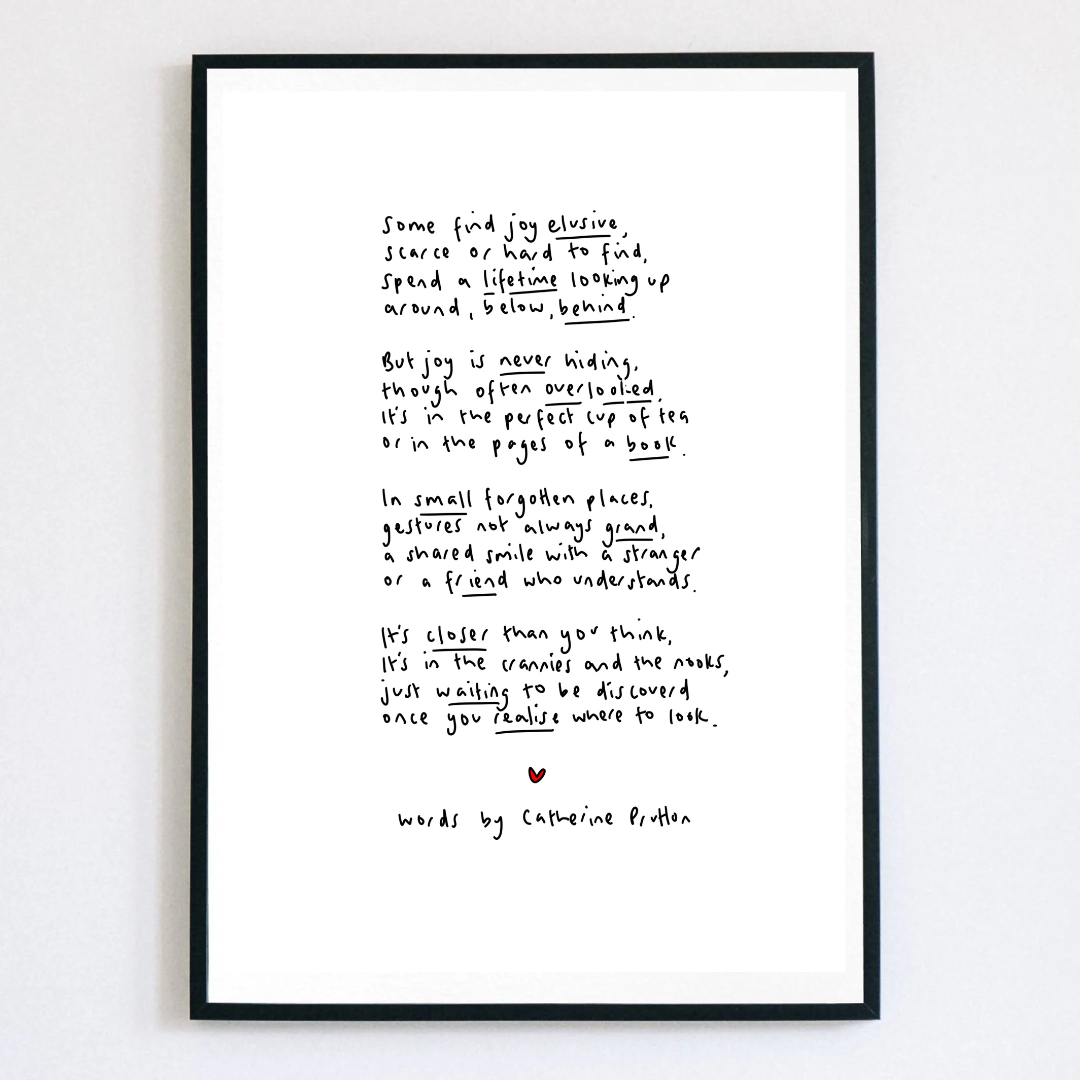 Welcome to Words by Catherine Prutton—a collection of heartfelt poem prints created to comfort, connect, and quietly inspire. It all began with pen and paper. In the early days, I handwrote every poem myself, line by line. As my business grew, I moved to digital tools—but every piece is still handwritten by me, not a font. That human touch remains at the heart of everything I make. Each poem is drawn from life’s quiet moments—the beauty, the mess, the in-betweens. Whether you’re celebrating someone you love, reaching out during a hard time, or simply looking for words that feel like a deep breath, my prints are made to be felt as much as they are seen. At Words by Catherine Prutton, I believe in the power of words to hold space, offer hope, and say the things we sometimes can’t. These prints make meaningful gifts for birthdays, beginnings, losses, or no reason at all—just because they feel right.