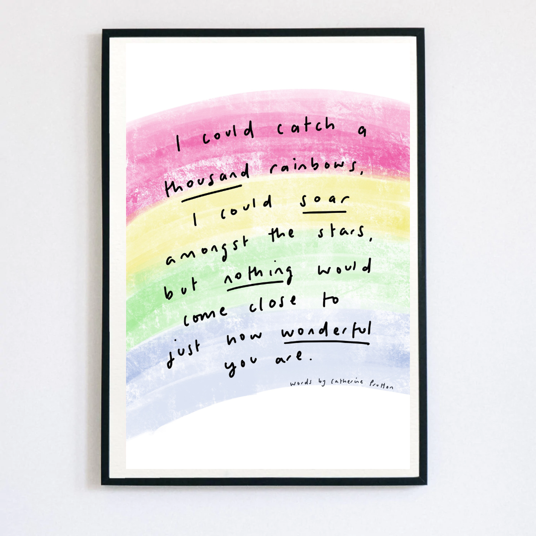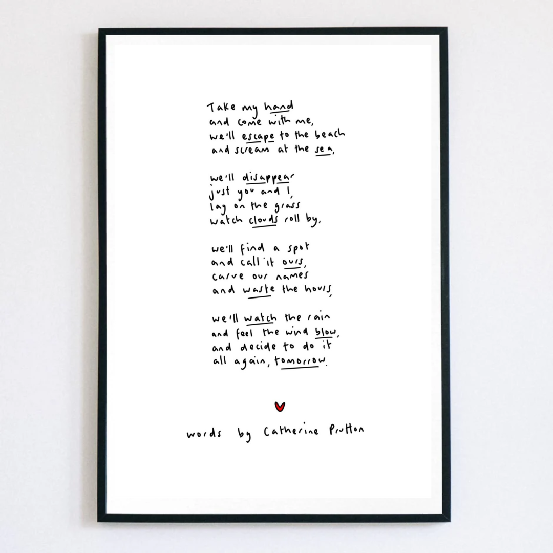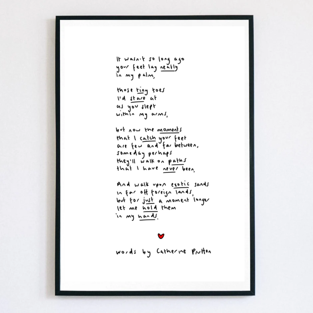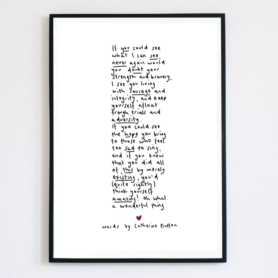 Welcome to Words by Catherine Prutton—a collection of heartfelt poem prints created to comfort, connect, and quietly inspire. It all began with pen and paper. In the early days, I handwrote every poem myself, line by line. As my business grew, I moved to digital tools—but every piece is still handwritten by me, not a font. That human touch remains at the heart of everything I make. Each poem is drawn from life’s quiet moments—the beauty, the mess, the in-betweens. Whether you’re celebrating someone you love, reaching out during a hard time, or simply looking for words that feel like a deep breath, my prints are made to be felt as much as they are seen. At Words by Catherine Prutton, I believe in the power of words to hold space, offer hope, and say the things we sometimes can’t. These prints make meaningful gifts for birthdays, beginnings, losses, or no reason at all—just because they feel right.
