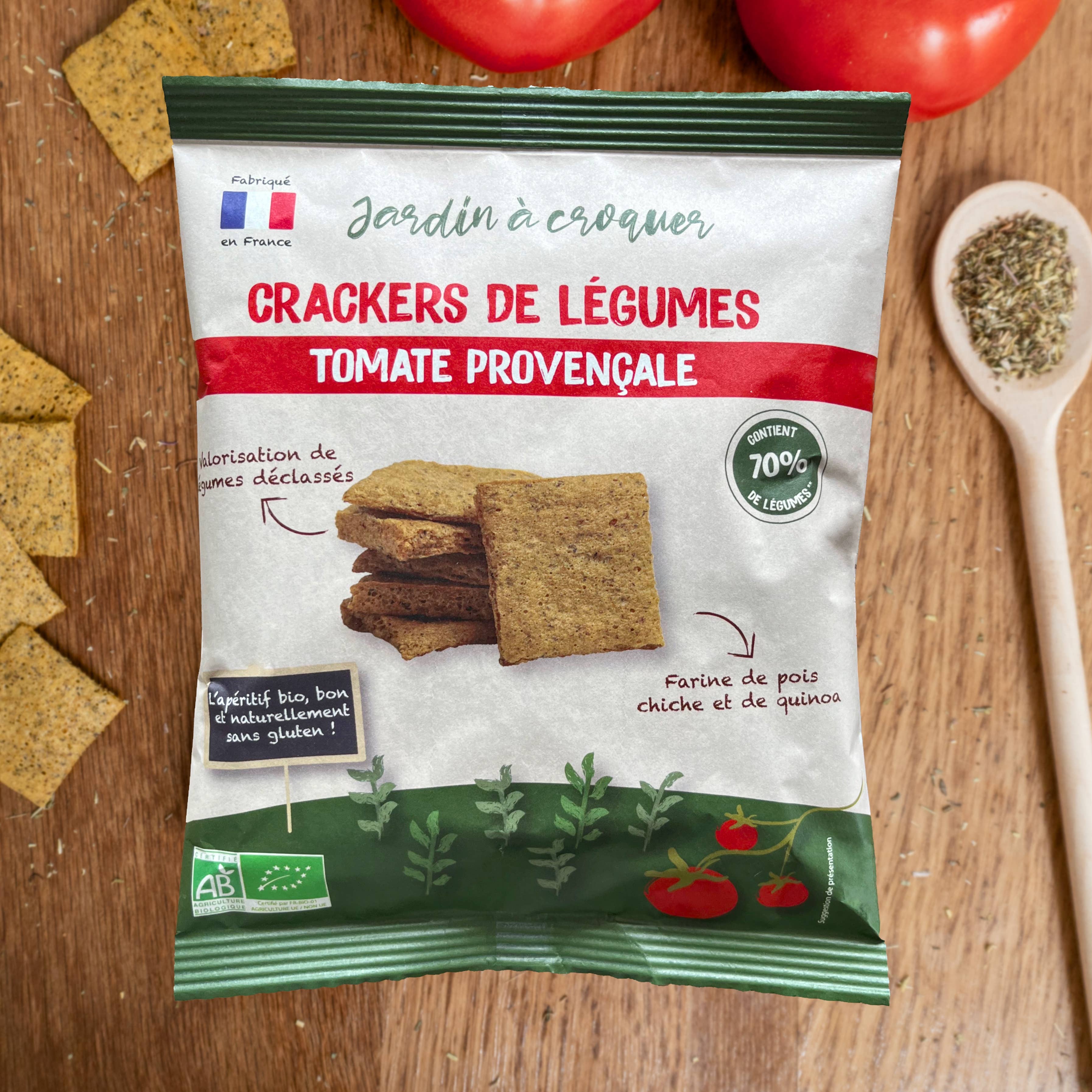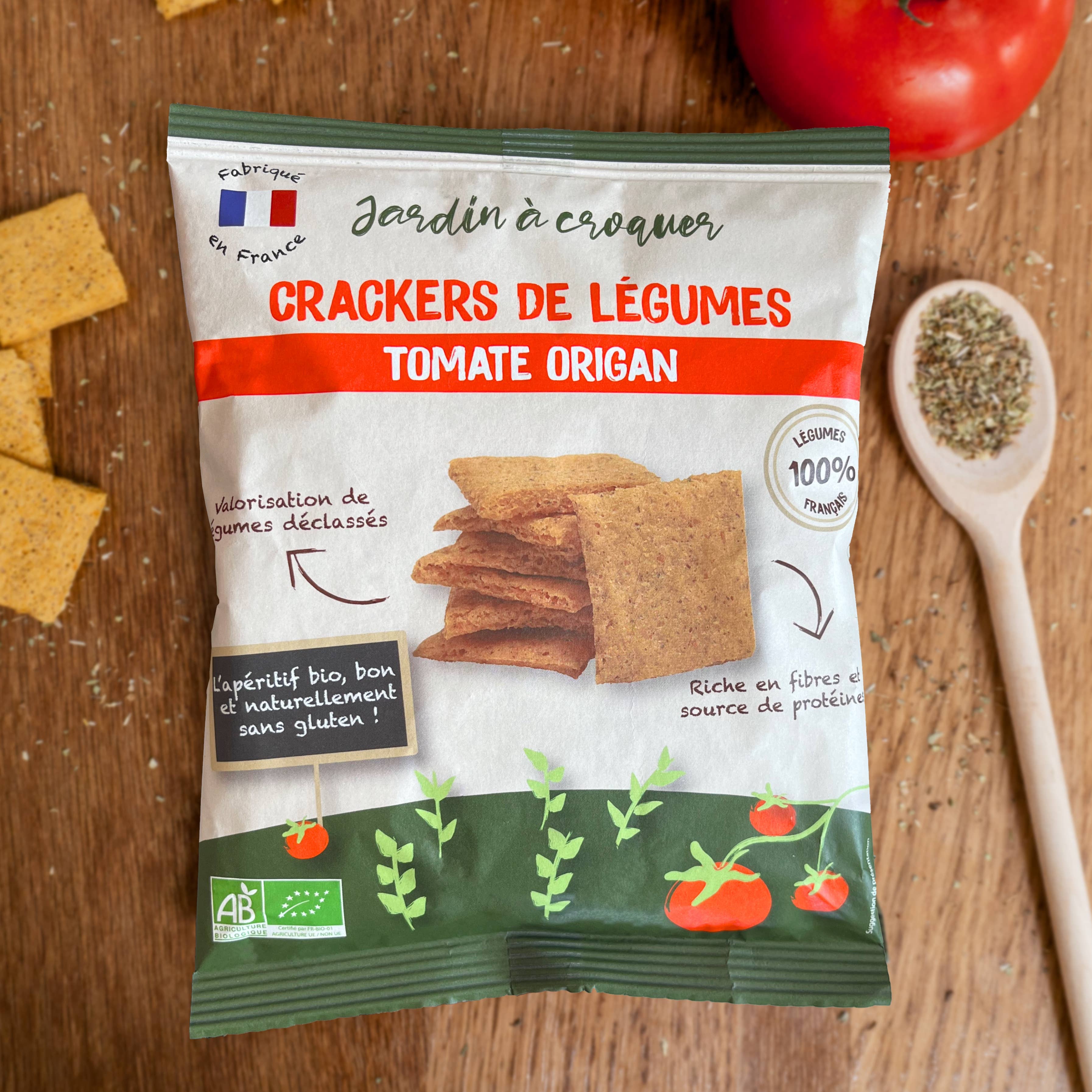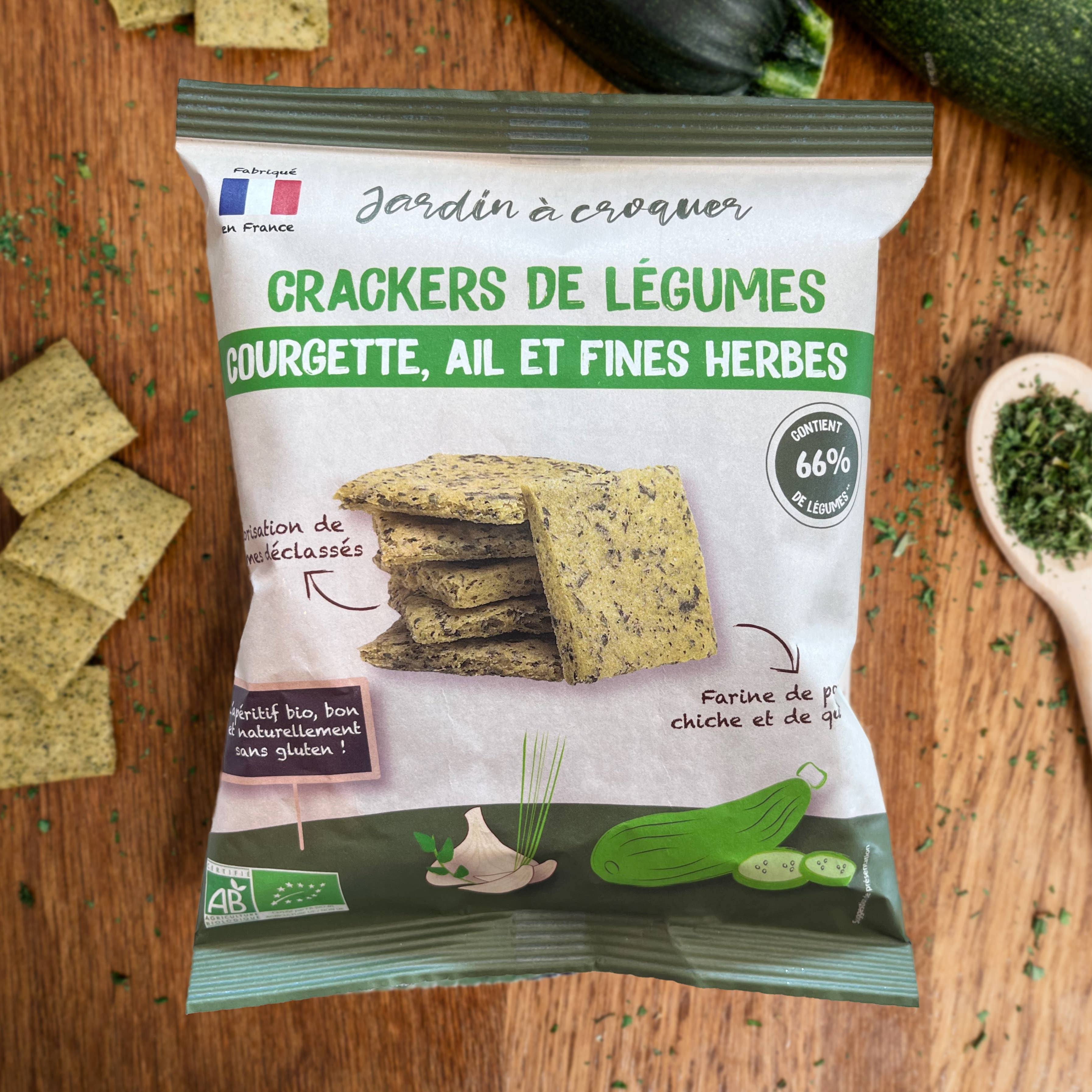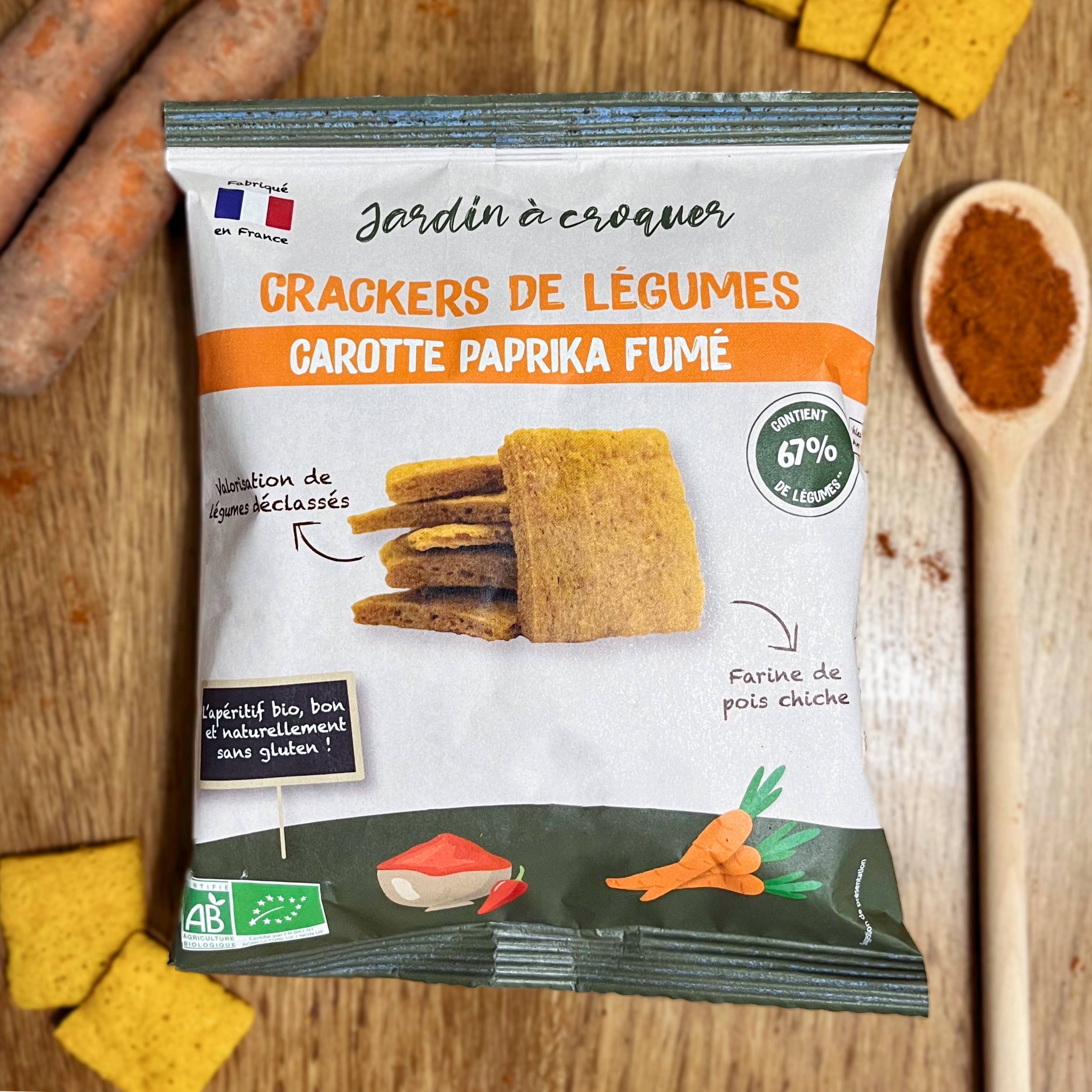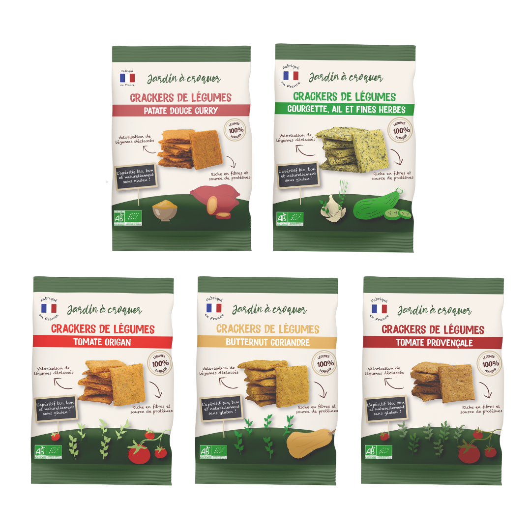 Jardin à Croquer is a brand that offers an appetizer range made from 100% French vegetables. Our "Vegetable Crackers" are made in our facilities in Loir-et-Cher. Our manufacturing process preserves the proteins, fibers, and good taste of the vegetables. They are made from downgraded vegetables (off-size, overproduction, sorting discrepancies). We work with local farmers from the Centre-Val de Loire region. 100% of our vegetables are French. Our healthy and delicious products are: - Naturally gluten-free - Composed of 70% vegetables - Without preservatives and artificial flavors - 100% plant-based How to consume vegetable crackers? • To dip in spreads • As toast (check the appetizer suggestions on the back of each of our packets) • With hummus, cheese, or homemade guacamole • As a complement to your soup or salad