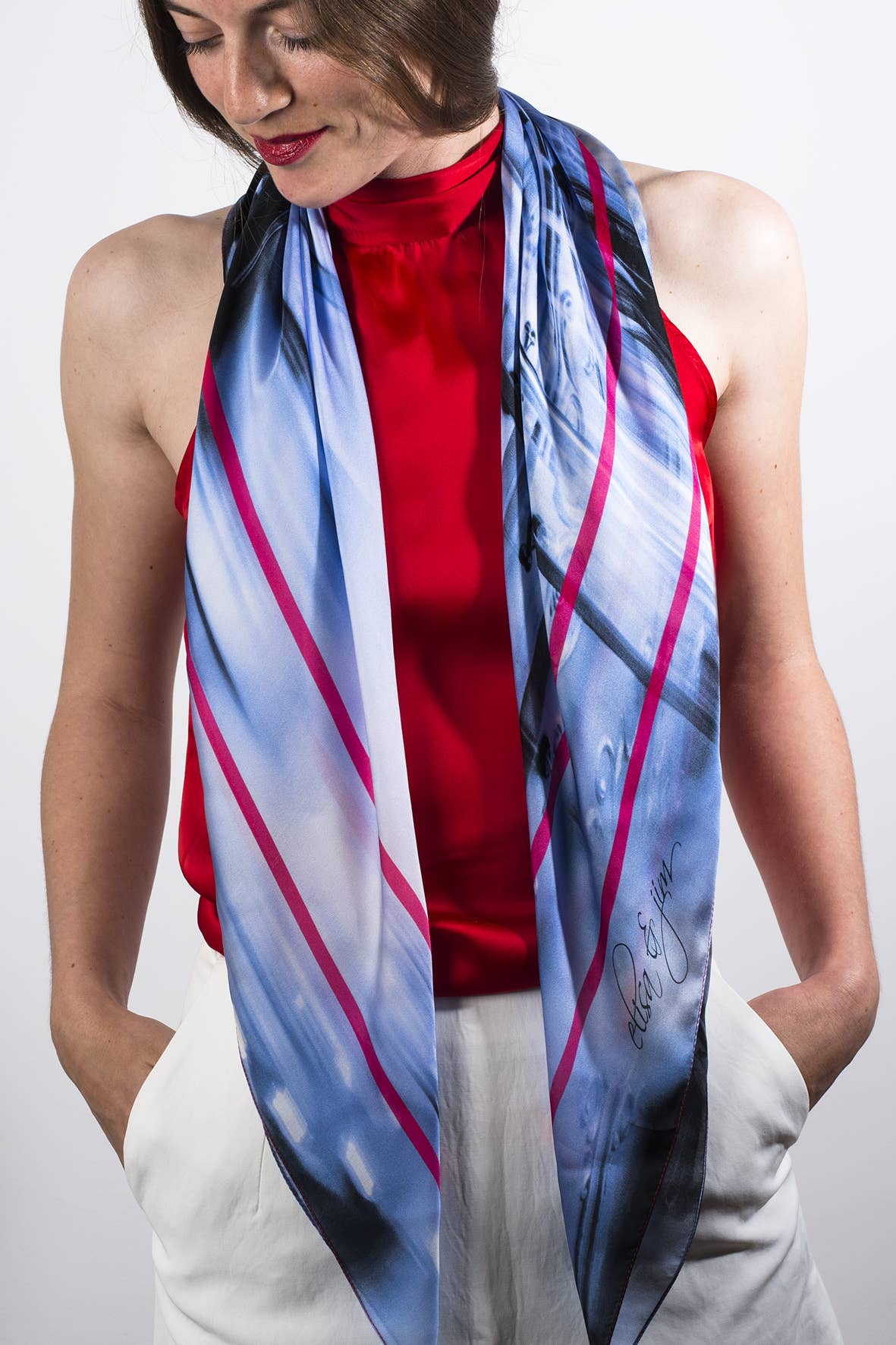 Half Parisian, half Londoner, Isabelle, the founder of Elisa & Jim, graduated in textile design from the prestigious Central Saint Martins School College of Art and Design. As a creator of exclusive fabrics for Parisian haute couture and international trend offices, and passionate about photography, it became evident to merge the two passions: the brand was born. Elisa & Jim is a colorful, sparkling, and sophisticated vision of women's fashion accessories. A blend of French chic and British boldness, reflecting the designer's dual culture. A completely European concept, thanks to French and Italian craftsmanship. Each print is unique and exclusive: a personal photograph composed like a pattern.