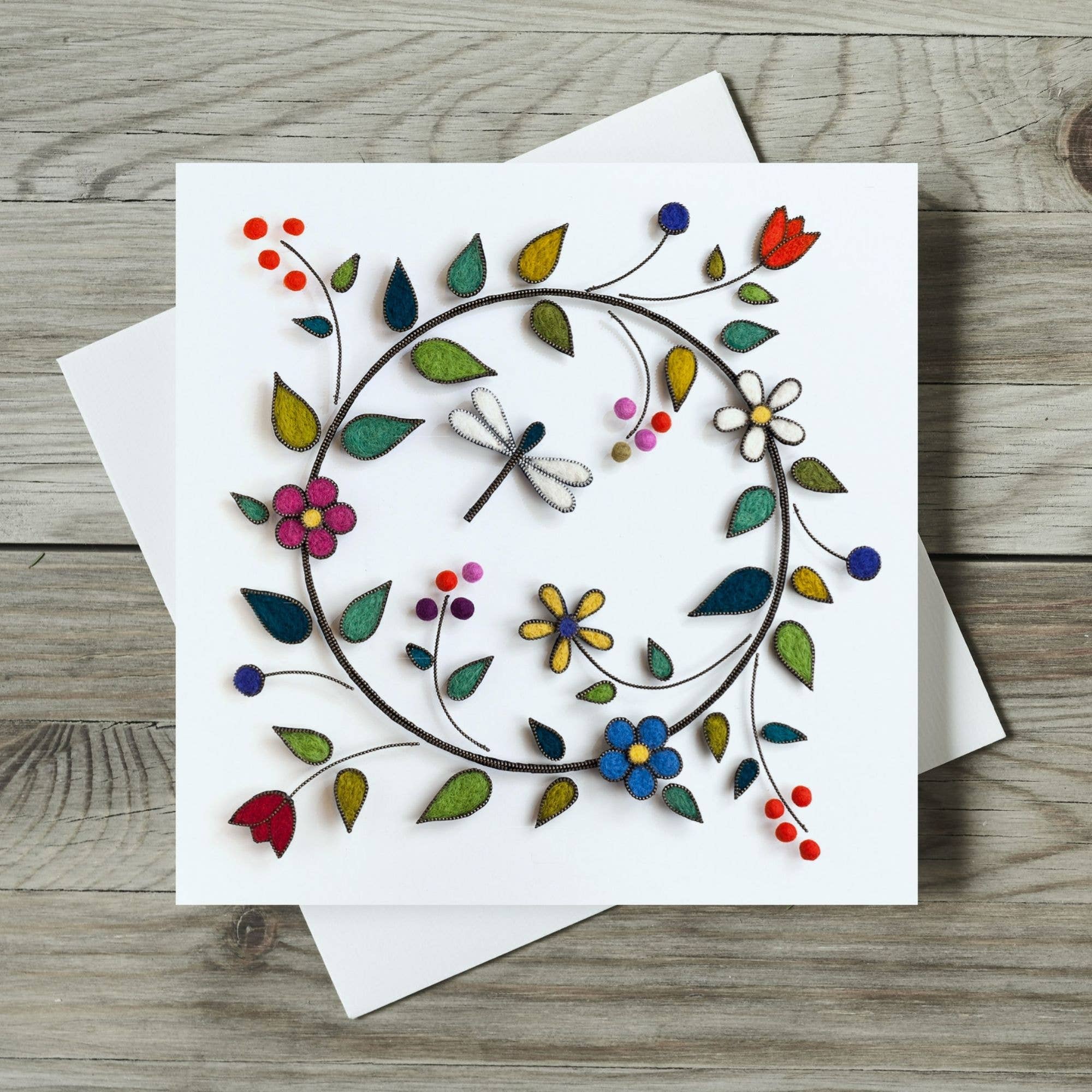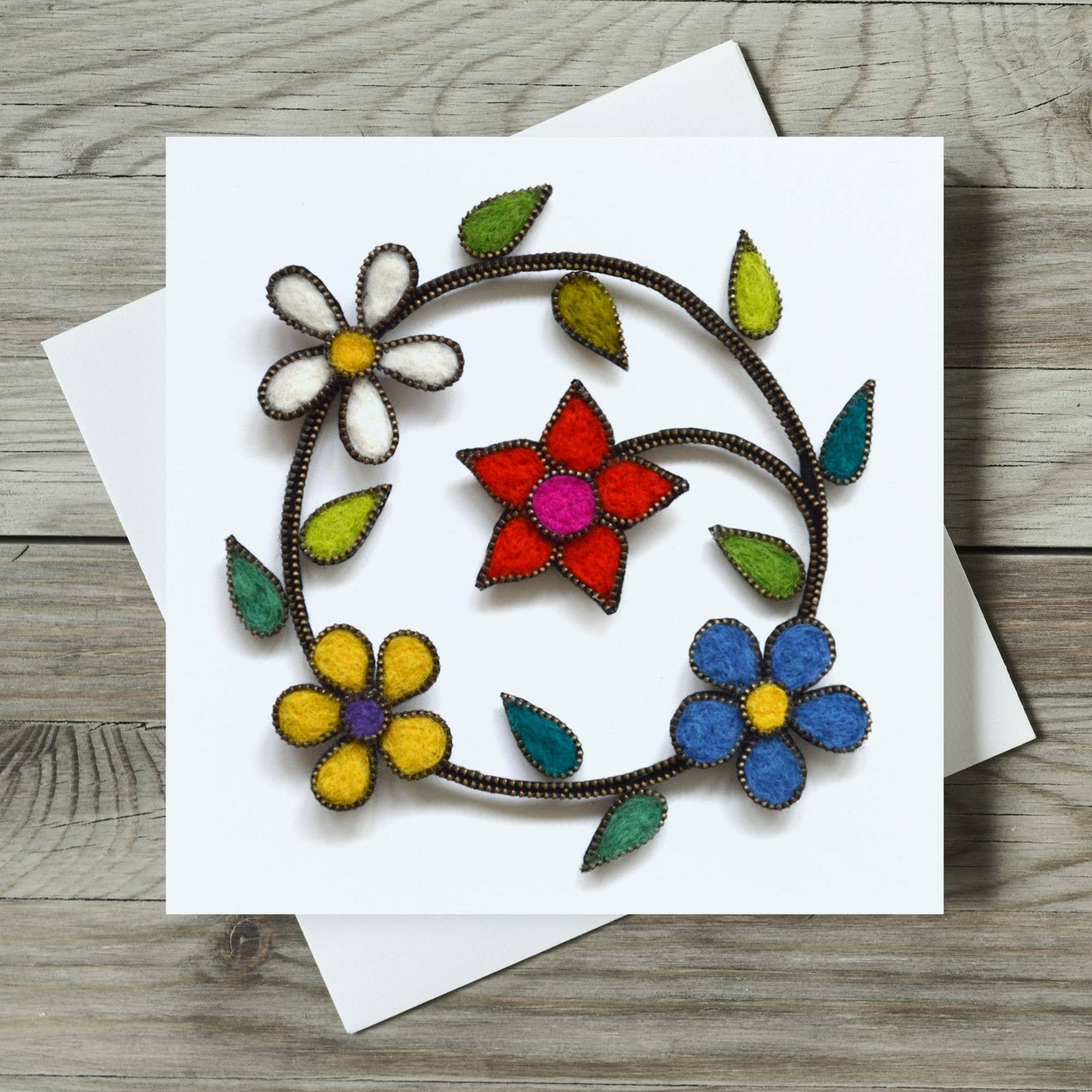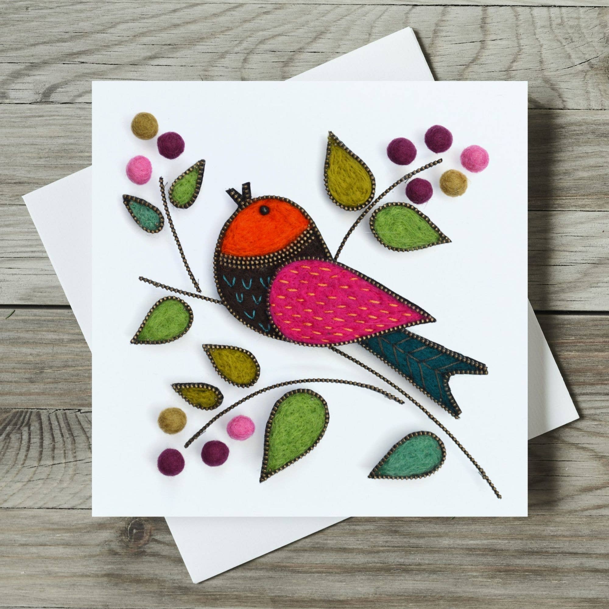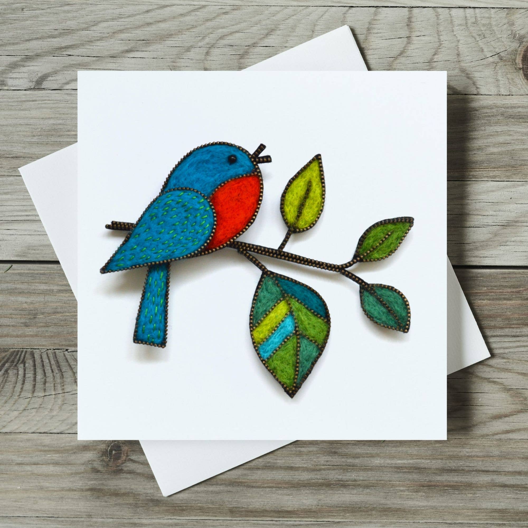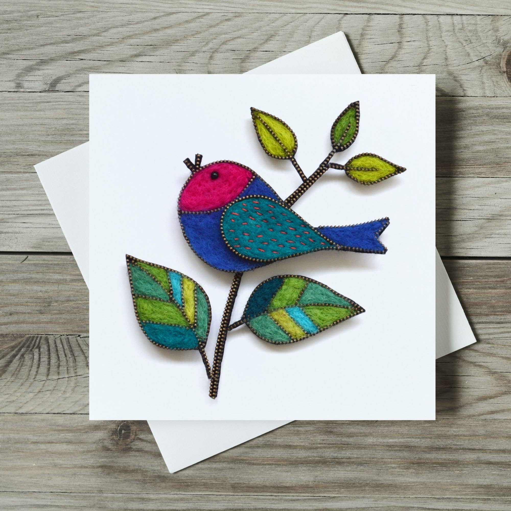 Nicky’s work begins with hand-made felt, shaped into stylized birds, flowers, and other natural motifs. Each piece is edged with metal zips and delicately hand-embroidered for a vivid pop of colour and texture. By mounting these components at different heights with small pins, Nicky creates subtle shadows that bring depth and dimension to her designs. Once completed, the artwork is professionally photographed, capturing every tiny stitch and unique detail, and then transformed into high-quality greeting cards. These cards showcase The eye catching designs are professionally printed onto smooth semi-gloss card and presented in bio-degradable cellophane bags. Since starting my online shop in 2022 I’ve had over 5,000 Etsy orders, two Etsy bestseller greeting cards, Star Seller status and all my cards given the ‘Etsy Pick’ seal of approval. "I like to give unique cards. These are perfect." "I was thrilled with this card - the detail is superb and because of the lighting when the original was photographed it gives the card a 3D effect." "The quality of these cards are outstanding! When the first one came, I was amazed with just how well it looked, so I ordered some more!" "Sharp bright images, pleasingly arranged. Stands out from the crowd. Caught my eye immediately." The photos show a retail display and a close up detail of one of the printed card designs.