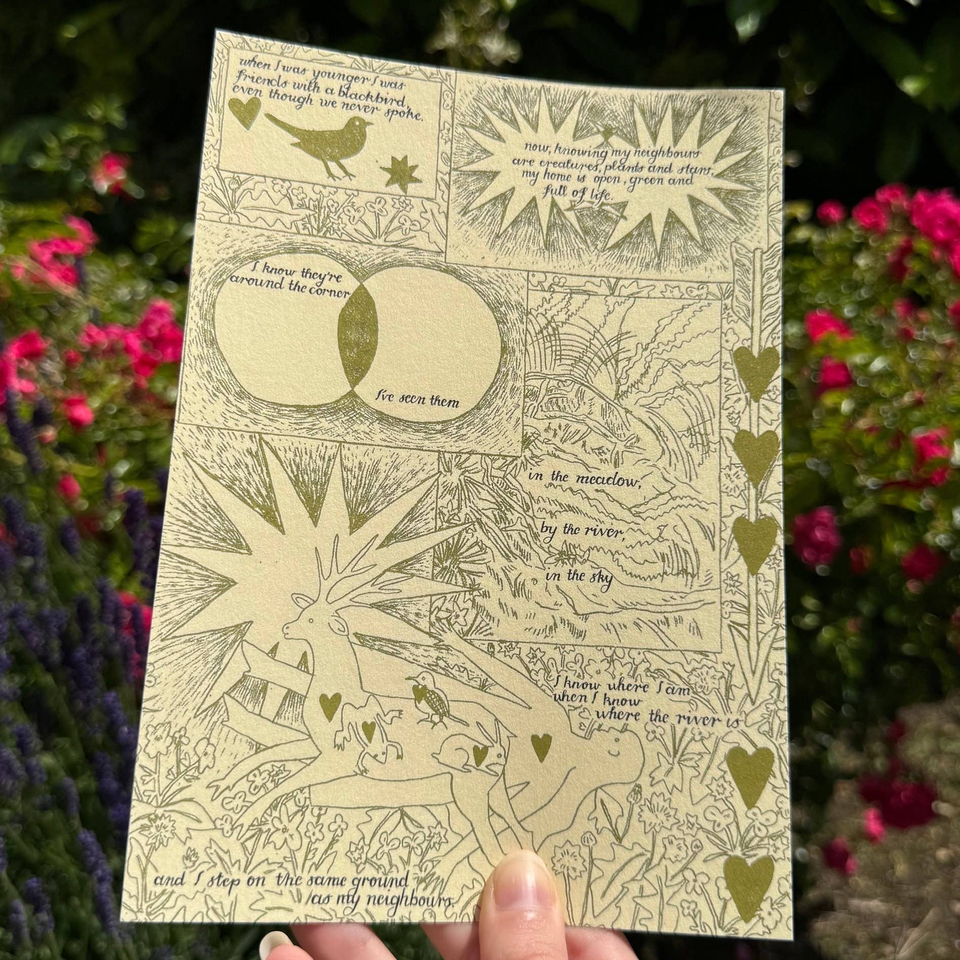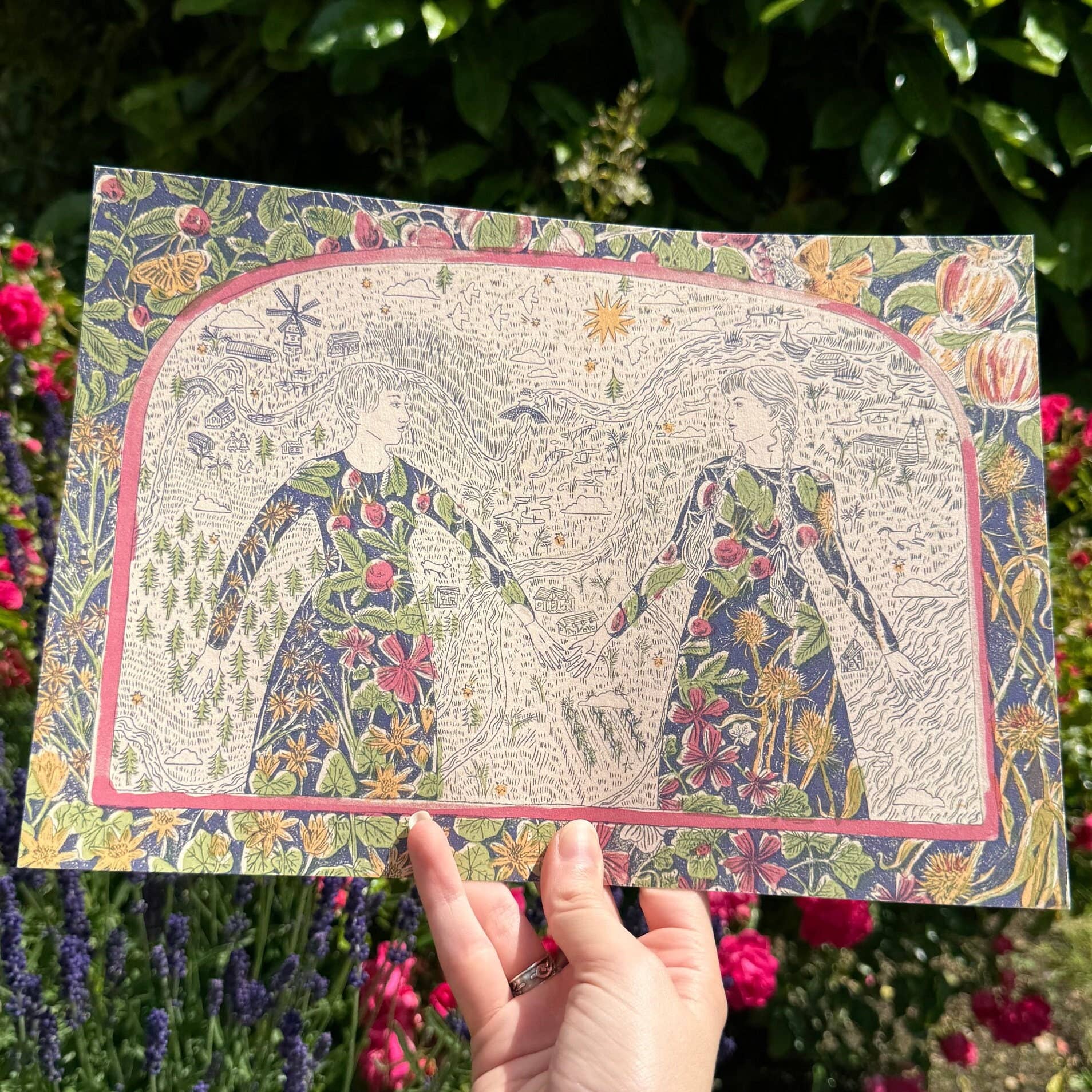 Tulips and Heather brings together the illustrative work of Maya Chessman and Freya Elise Kemp. They are inspired by folklore, queerness and the magic of nature and create prints, stationery, greetings cards, garlands, badges and more! They’ve been making things together since 2021 & share a love of hand-made craft & arts, blending together Maya's detailed pencil drawing with Freya’s intricate paper cut designs. The majority of our work is paper goods, printed on recycled and eco-conscious papers, all of our products are produced in the UK and everything is packaged in glassine bags, which can be recycled or compostable cellophane, made of vegetable starch.