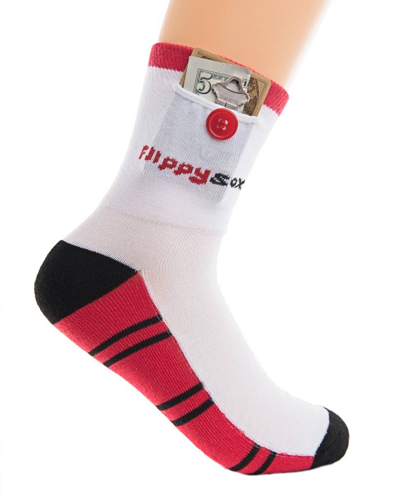 Flippysox was created by an 8-year old from California named Jordan. She was at an event when she wanted someplace safe to put her money so she stuffed the money into her sock creating the first SOCK WALLET™. Flippysox now comes with a ruggedized zipper pocket that can fit a credit card, money and other valuables so you can PLAY MORE AND WORRY LESS